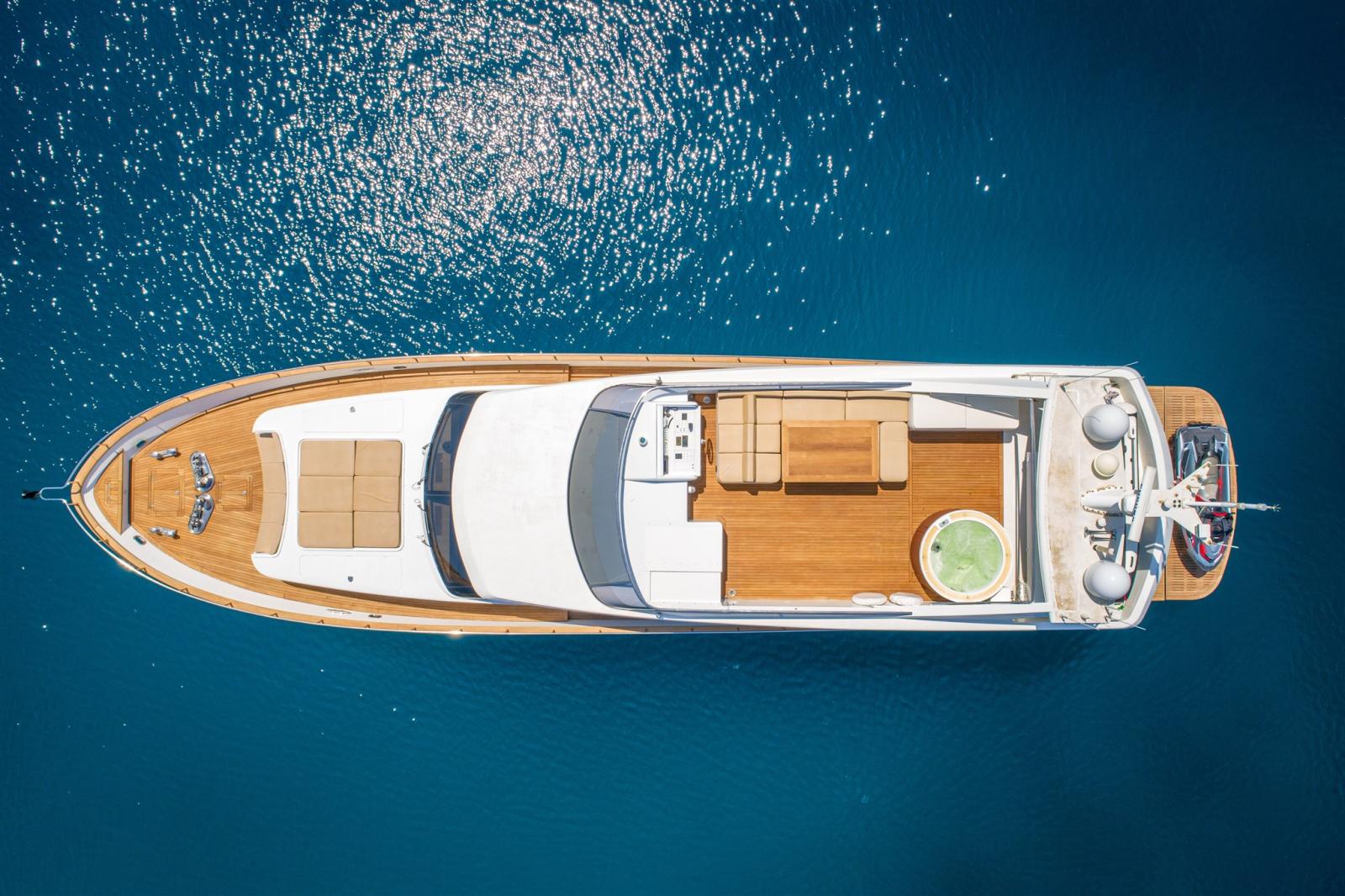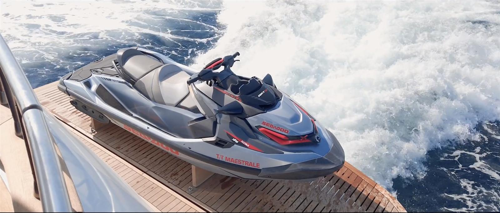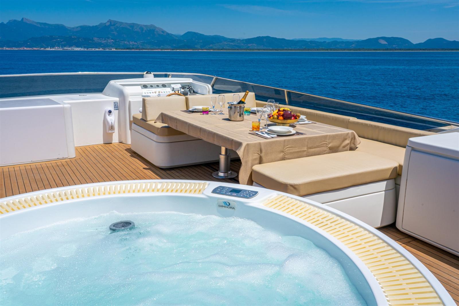 Allarme fumo/gas, Allarme motore, Allarme sentina, Autoclave, Camminamenti laterali in teak, Doccia esterna, Doppia timoneria, Faro orientabile, Flap idraulici (N°2), Gruette per tender, Impianto antincendio, Indicatori Flaps, Lavaggio catena, Lavandino nel Pozzetto, Luci di cortesia, Luci subacquee, Passerella, Piattaforma, Pompa di sentina automatica, Porta laterale, Pozzetto Teak, Presa 220V banchina, Raddrizzatore, Salpa Ancore Idraulico, Scaletta da bagno, Selle per Tender, Stabilizzatori, Tavolo pozzetto, Tender, Tromba, Winch Idraulico.