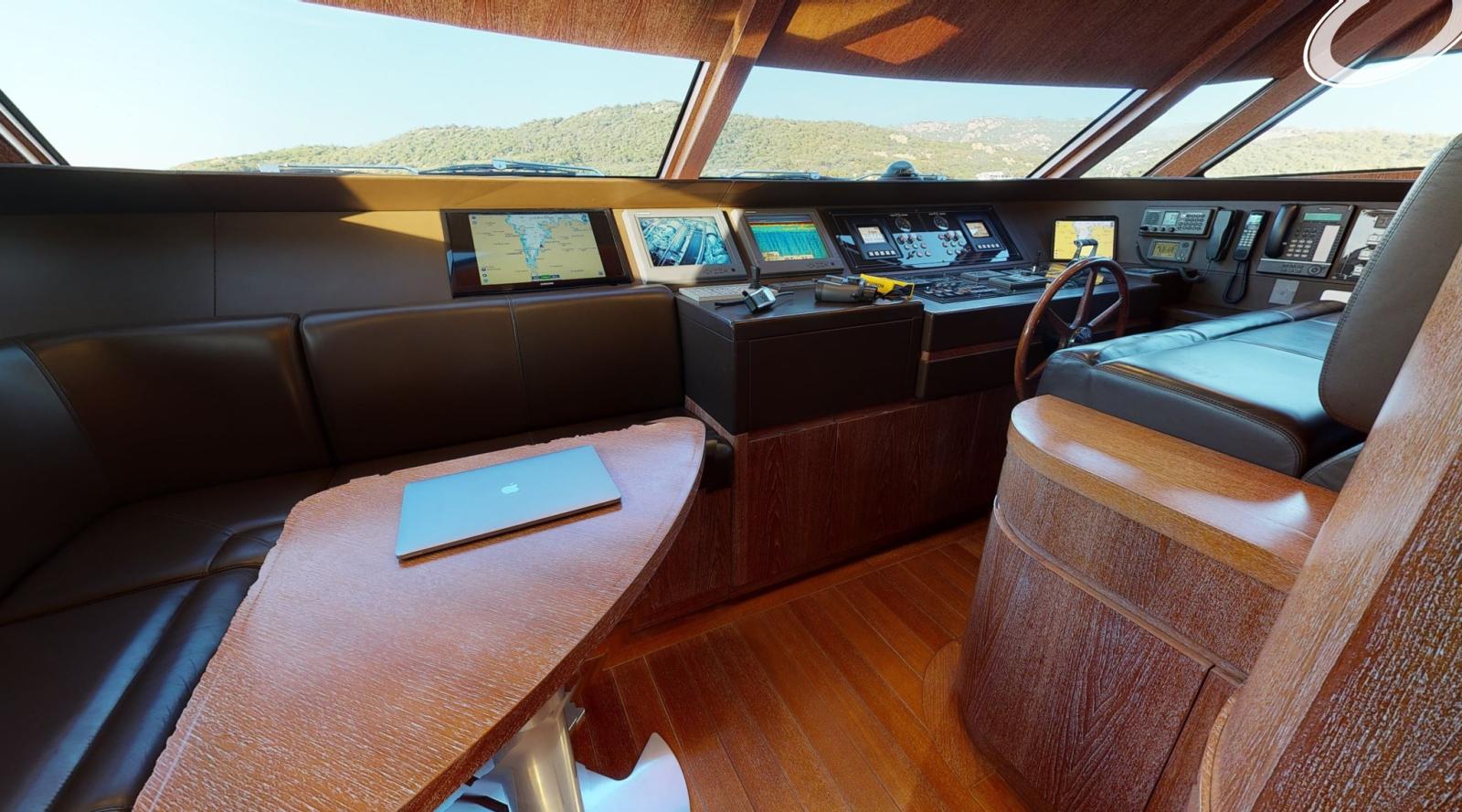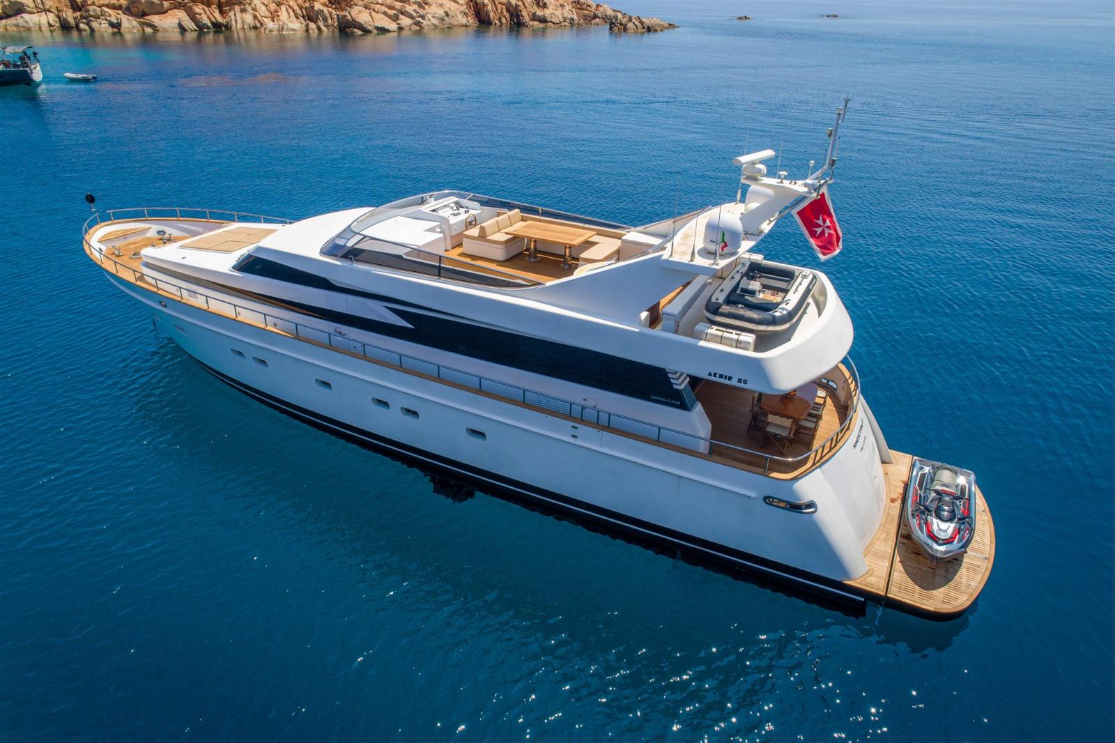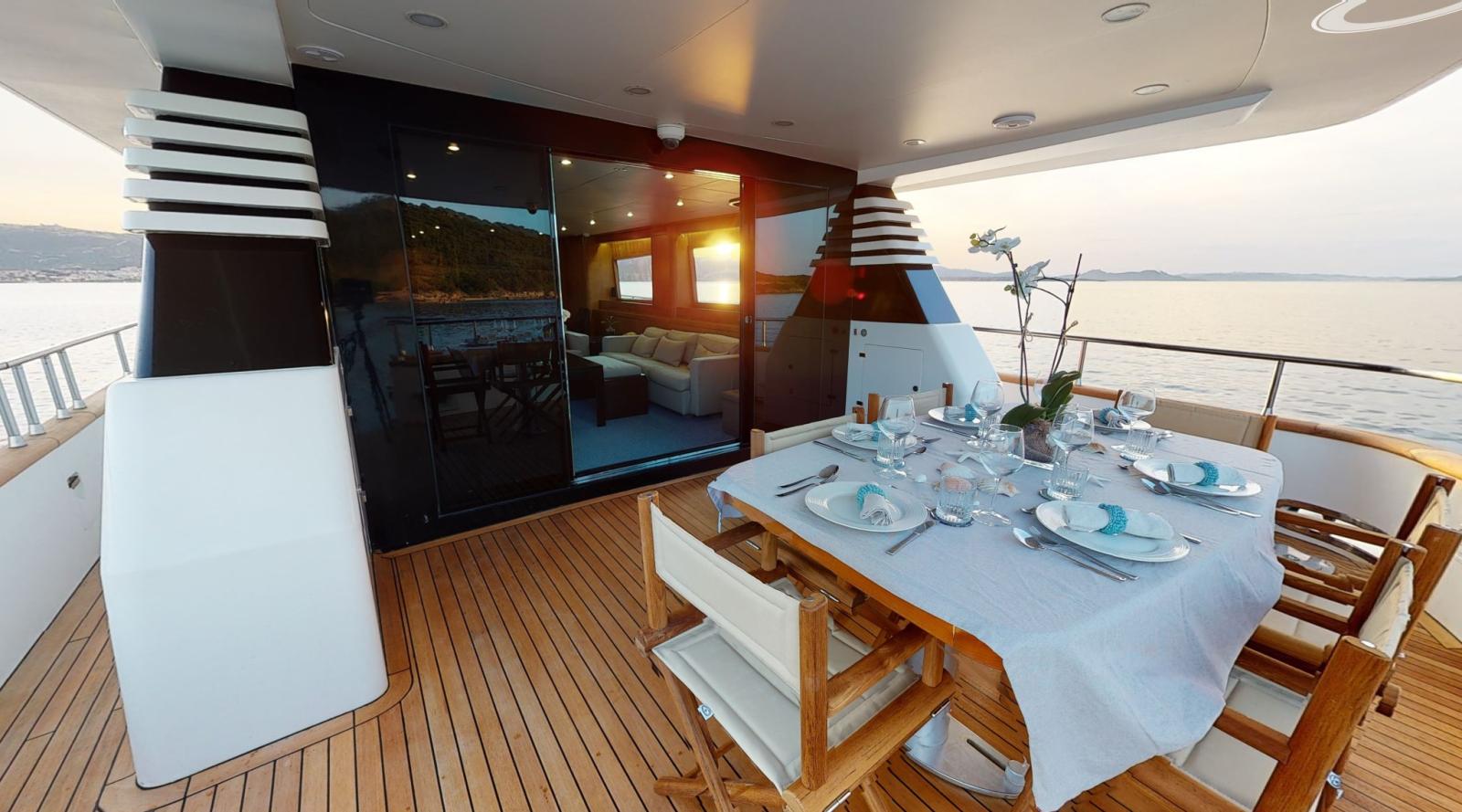 Allarme fumo/gas, Allarme motore, Allarme sentina, Autoclave, Camminamenti laterali in teak, Doccia esterna, Doppia timoneria, Faro orientabile, Flap idraulici (N°2), Gruette per tender, Impianto antincendio, Indicatori Flaps, Lavaggio catena, Lavandino nel Pozzetto, Luci di cortesia, Luci subacquee, Passerella, Piattaforma, Pompa di sentina automatica, Porta laterale, Pozzetto Teak, Presa 220V banchina, Raddrizzatore, Salpa Ancore Idraulico, Scaletta da bagno, Selle per Tender, Stabilizzatori, Tavolo pozzetto, Tender, Tromba, Winch Idraulico.