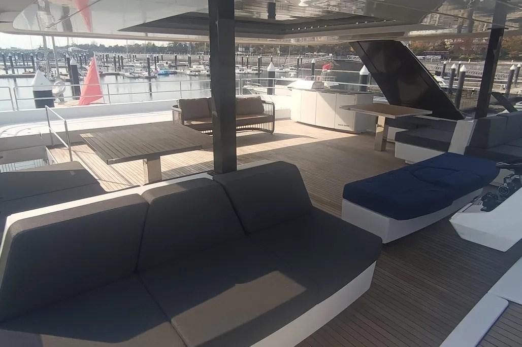 Il pozzetto di poppa offre ampi spazi per il relax e la zona pranzo. Sotto il divano modulare, il garage ospita un grande jet ski e giochi d'acqua, mentre la piattaforma da bagno idraulica ospita il tender e offre ulteriore spazio per rilassarsi in riva al mare