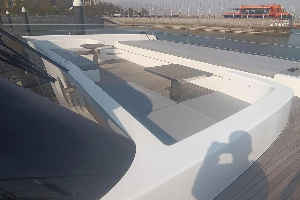 Il flybridge ha un layout aperto e offre aree relax, ampi prendisole e un angolo bar con barbecue
