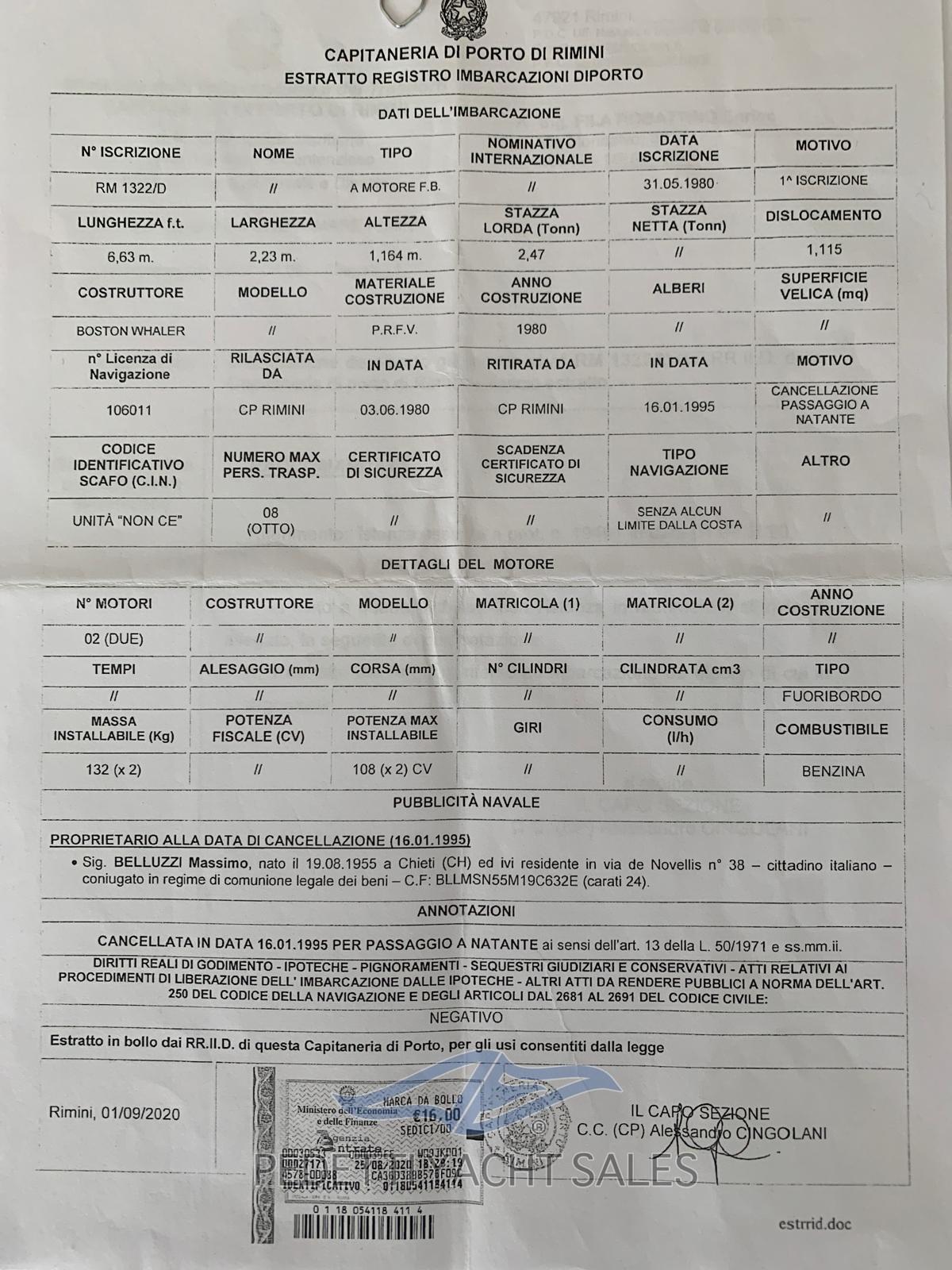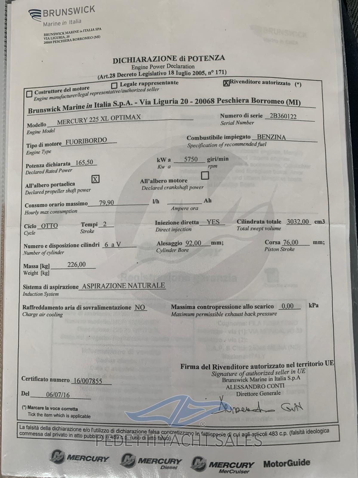 Allarme motore, Alternatore, Autoclave, Cavo corrente di banchina, Doccia esterna, Parabordi, Piattaforma, Pompa di sentina automatica, Presa 220V banchina, Salpa Ancore Elettrico.