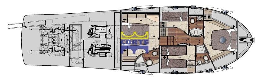 musone di prua inox, protezione inox prua, pulpito in acciaio inox, lift plancetta, T top pozzetto, filtri doppi racor, Blower, joy stick ancoring position, intruder interceptor Volvo, boccaporti fly in dinette apribili, underwater