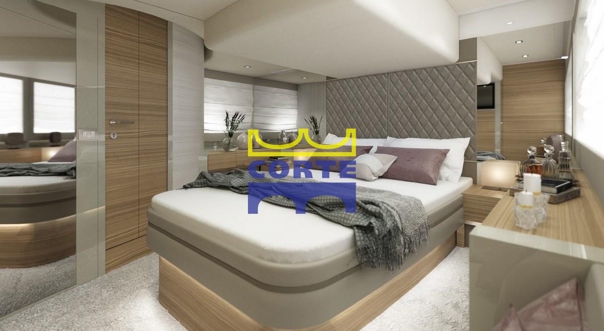 Cabina armatoriale matrimoniale a centro barca con finiture in legno e pelle, pavimento in moquette.