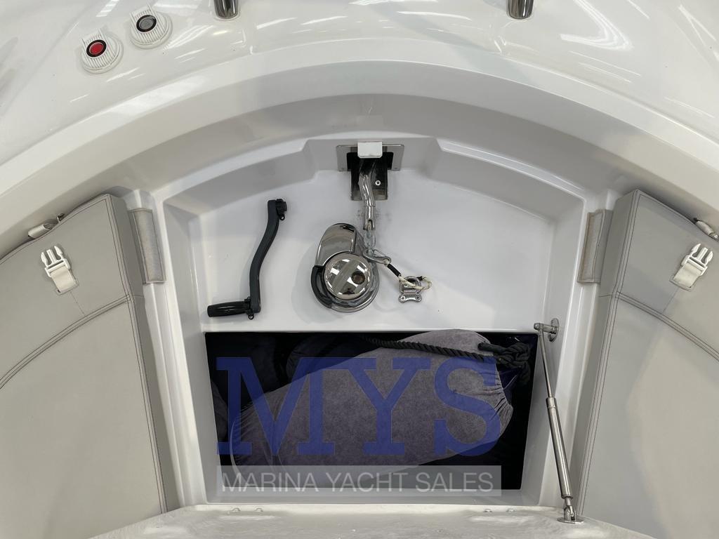 Allarme motore, Autoclave, Doccia esterna, Flap elettrici, Luci subacquee, Pompa di sentina automatica, Pompa di sentina manuale, Porta ingresso, Pozzetto Teak, Presa 220V banchina, Salpa Ancore Elettrico, Scaletta da bagno, Tavolo pozzetto, Tromba, T-Top.