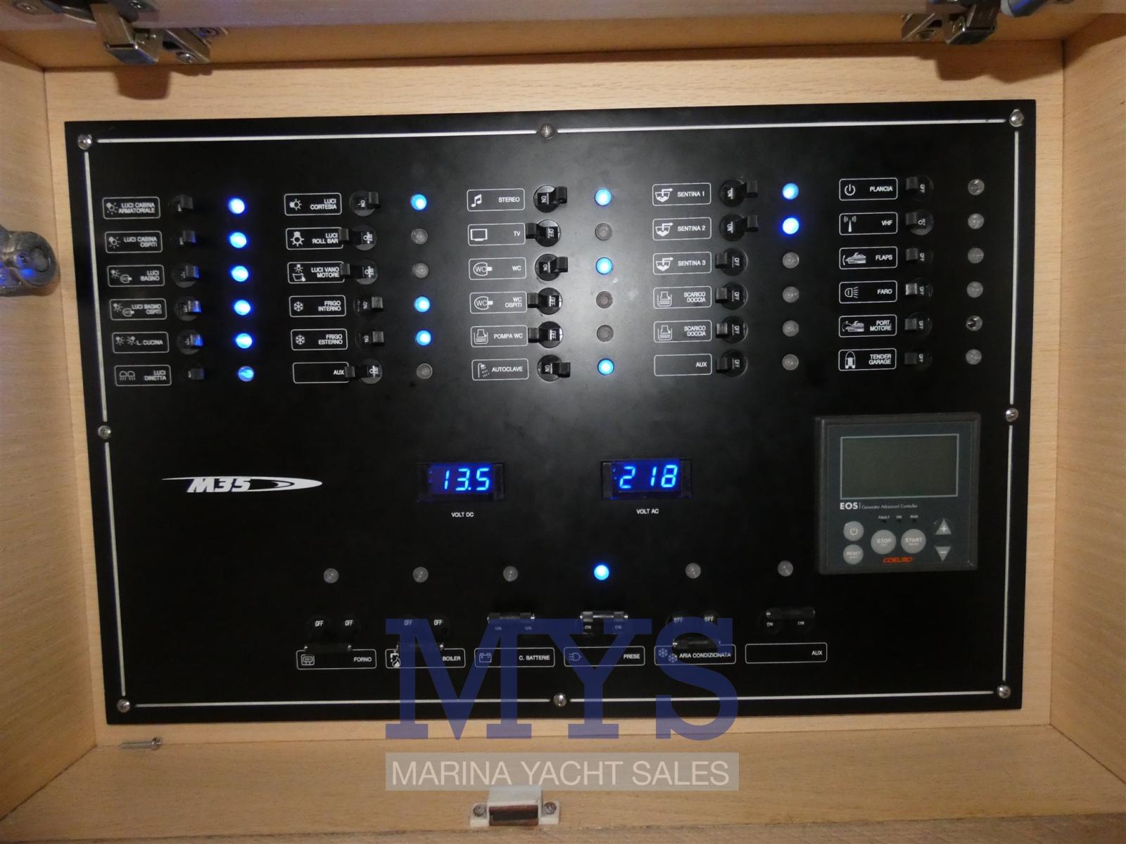 Allarme motore, Autoclave, Colorazione speciale, Doccia esterna, Faro orientabile, Flap idraulici, Hard top, Indicatori Flaps, Luci subacquee, Passerella, Piattaforma, Pompa di sentina automatica, Pompa di sentina manuale, Porta ingresso, Pozzetto Teak, Presa 220V banchina, Salpa Ancore Elettrico, Scaletta da bagno, Tavolo pozzetto, Tromba.