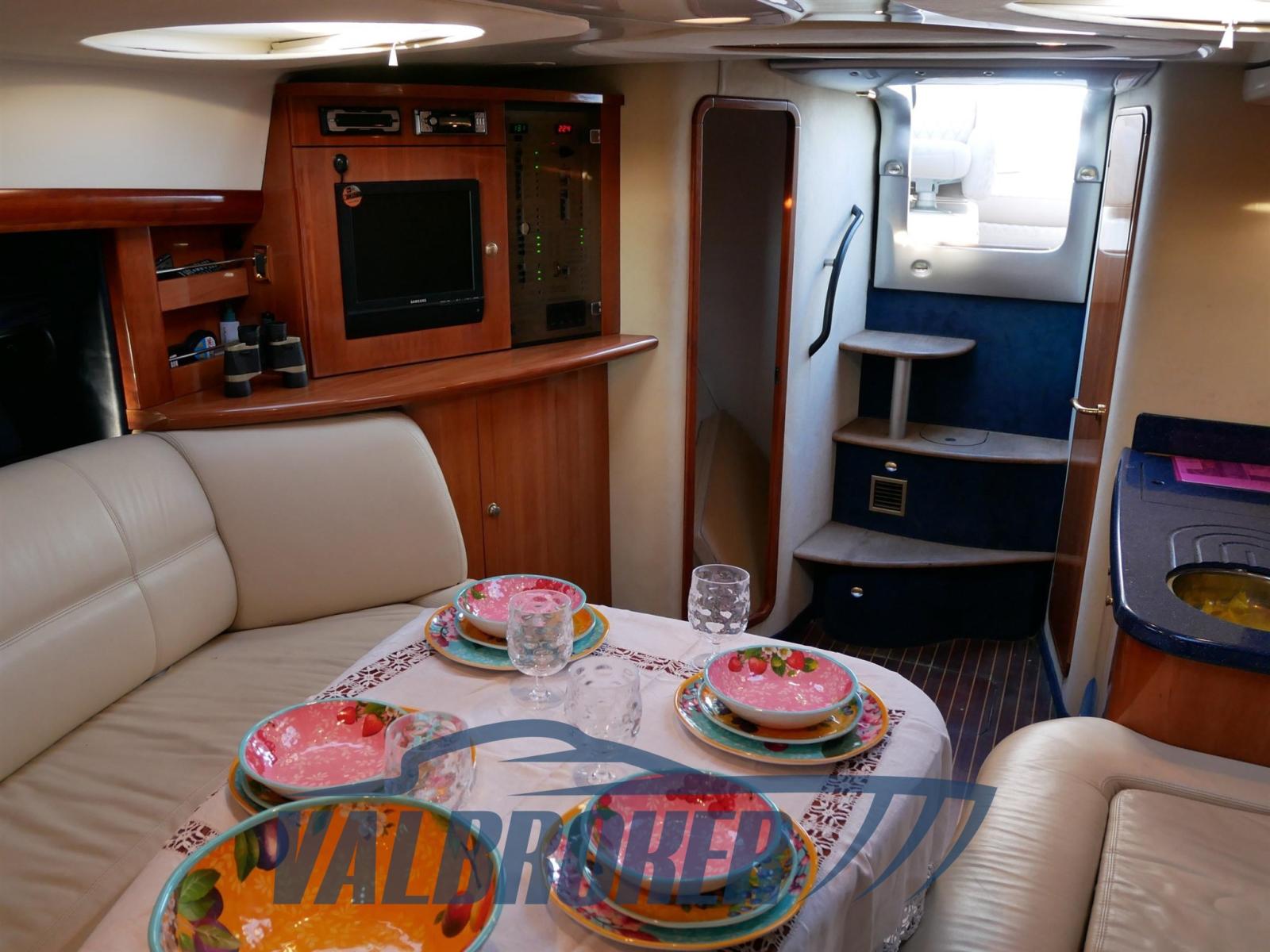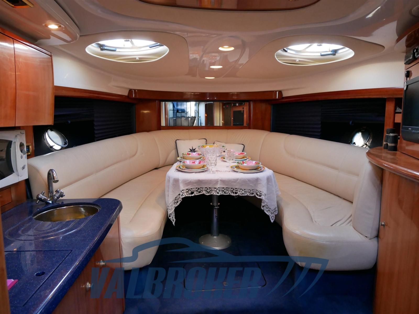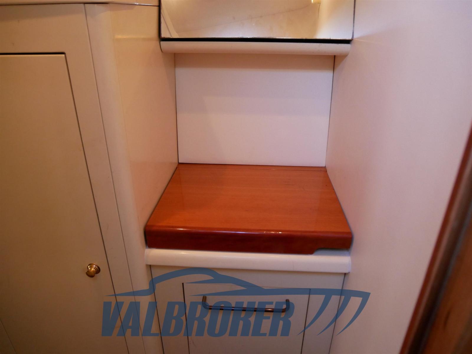 Sottocoperta si trova una spaziosa cabina di poppa matrimoniale una dinette trasformabile e un bagno con doccia. Full optional: aria condizionata caldo/freddo, pilota automatico, elica di prua, garage per tender, GPS. Teak sintetico che non richiedere manutenzione.