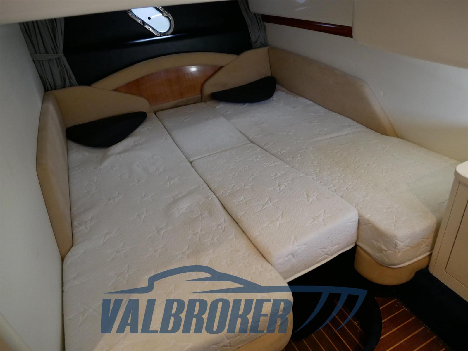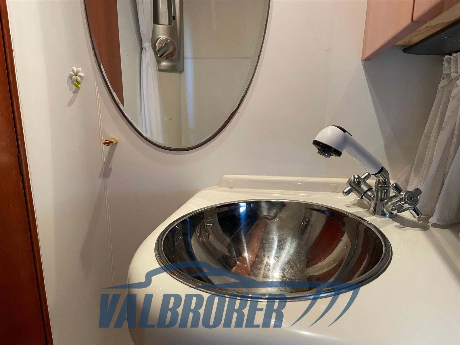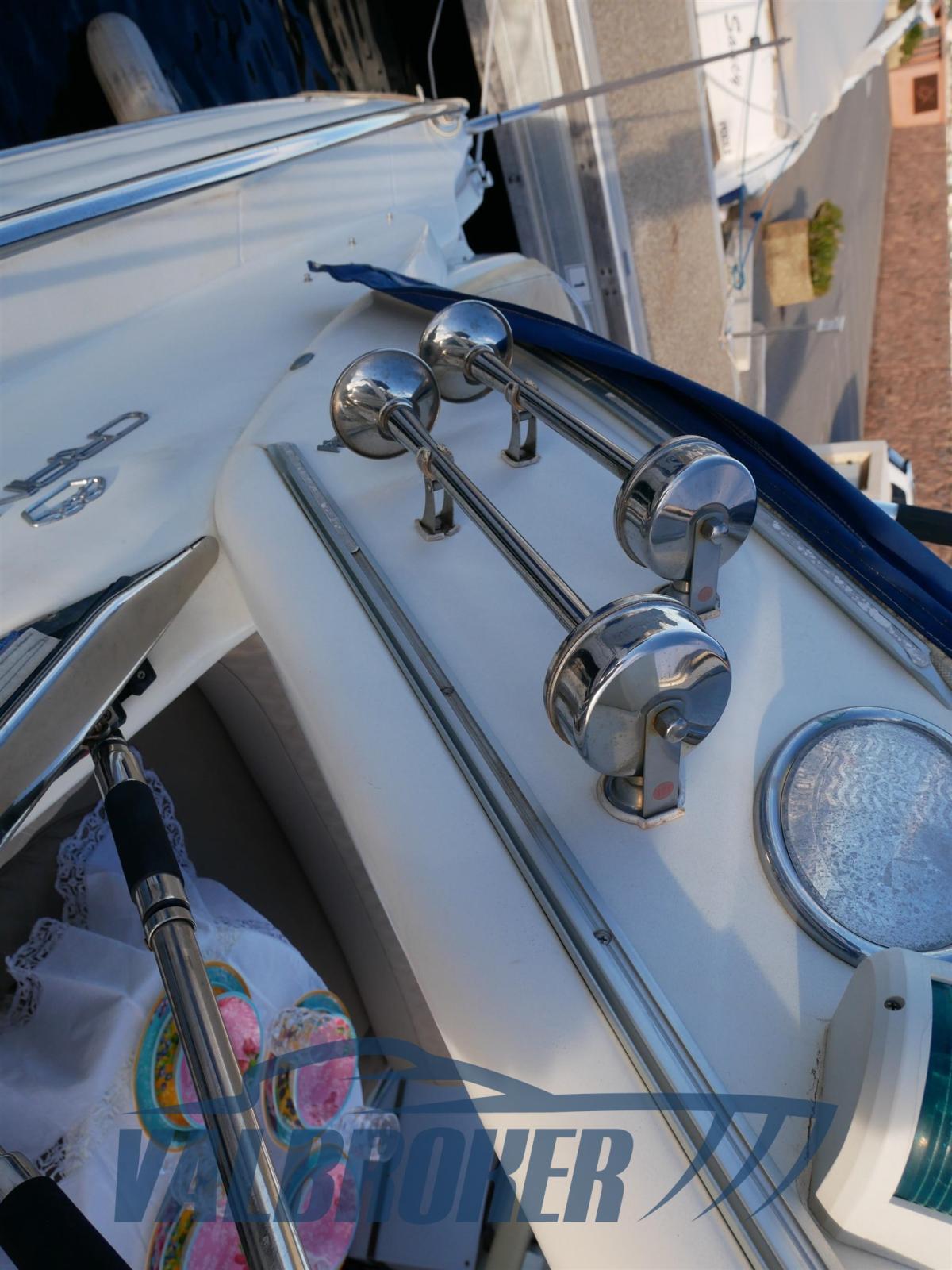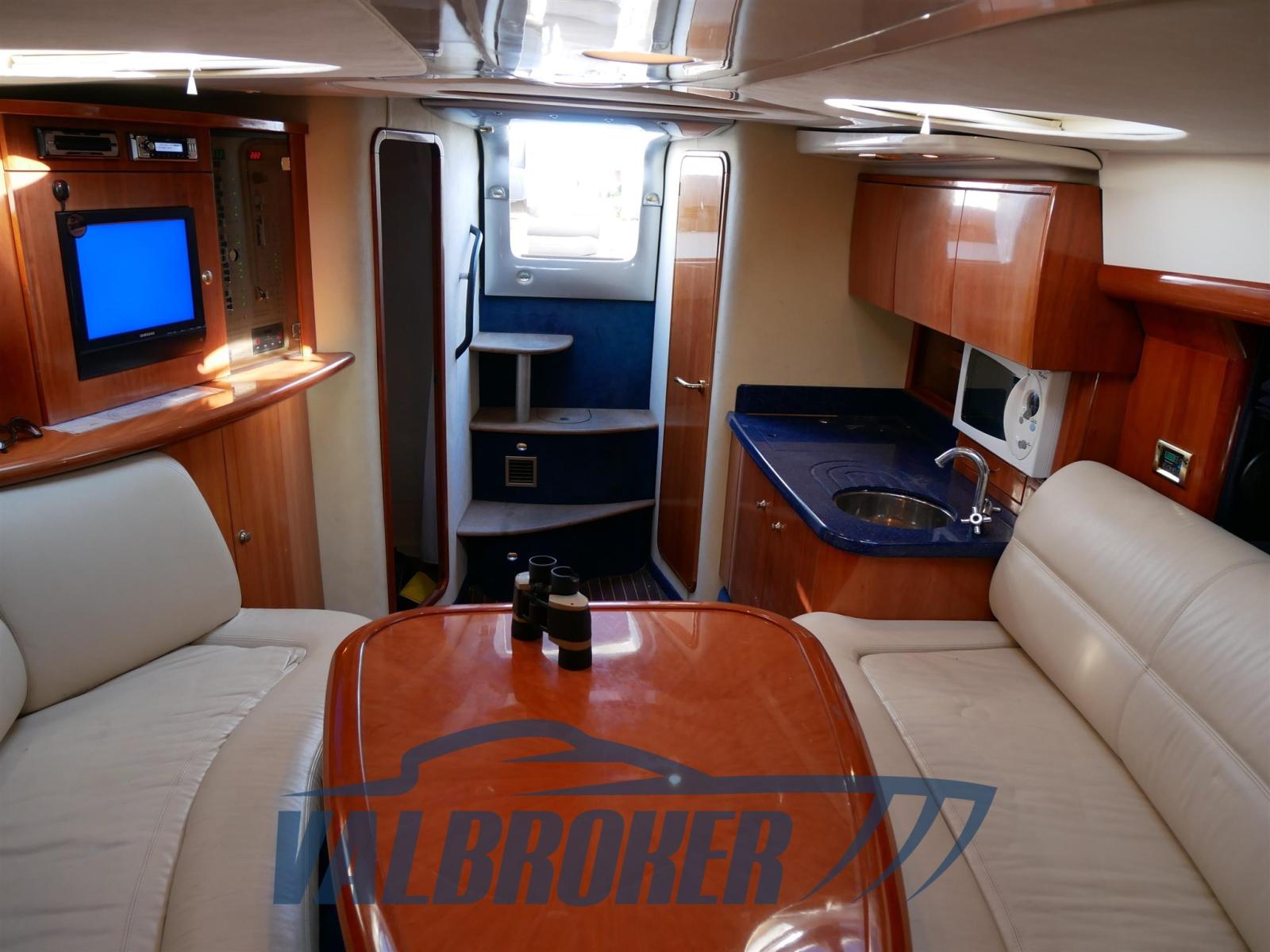 Sottocoperta si trova una spaziosa cabina di poppa matrimoniale una dinette trasformabile e un bagno con doccia. Full optional: aria condizionata caldo/freddo, pilota automatico, elica di prua, garage per tender, GPS. Teak sintetico che non richiedere manutenzione.