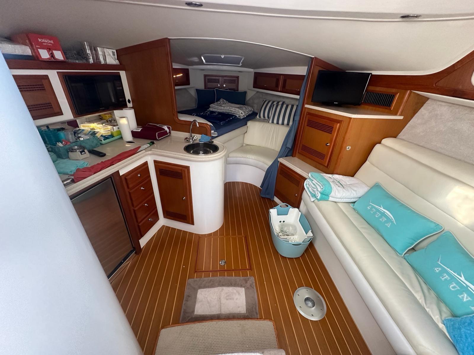 Entrando a dritta troviamo un divano a L che ha la possibilità di diventare un letto a castello sollevando lo schienale. A prua c'è un ampio letto matrimoniale. Sulla sinistra troviamo la cucina con ampio spazio di stivaggio.