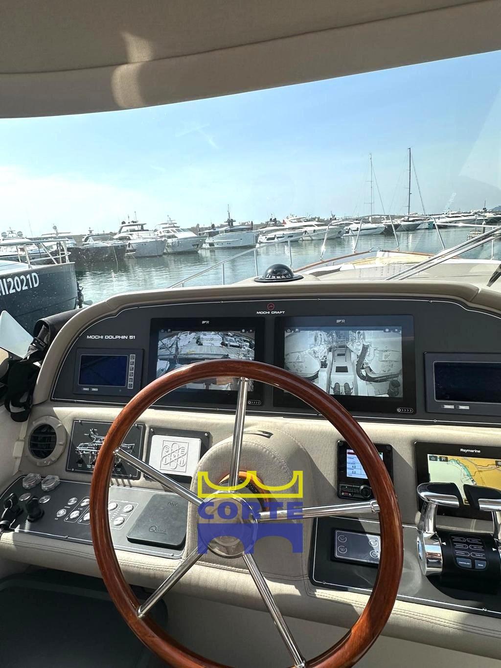 Bussola (Riviera), Comando motori elettronico, Computer di bordo (Man), Contametri catena (Quick), Display, GPS (Raymarine Axicom 12 P), Monitor dei consumi, Pilota automatico (Raymarine Axicom), Quadro comandi, Radar (Raymarine), Radio VHF (Raymarine).
