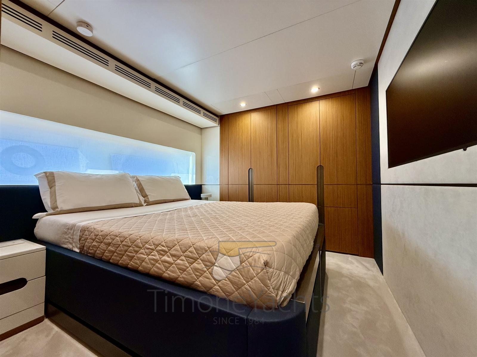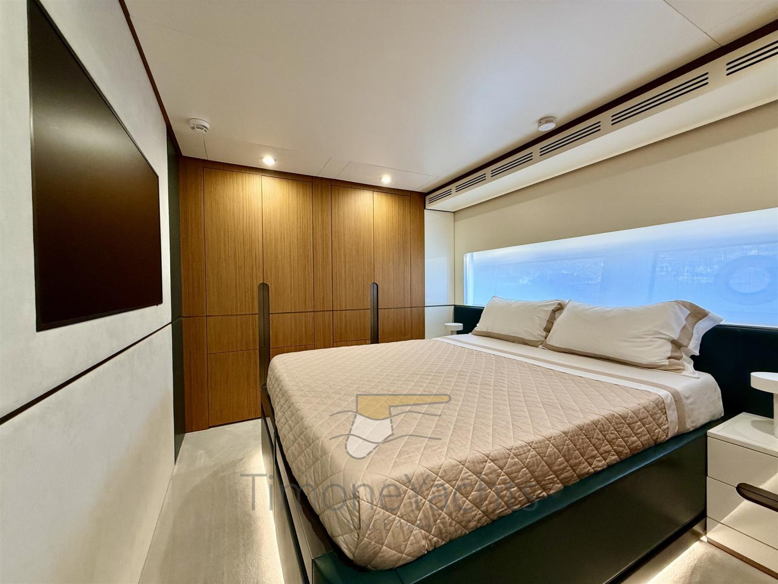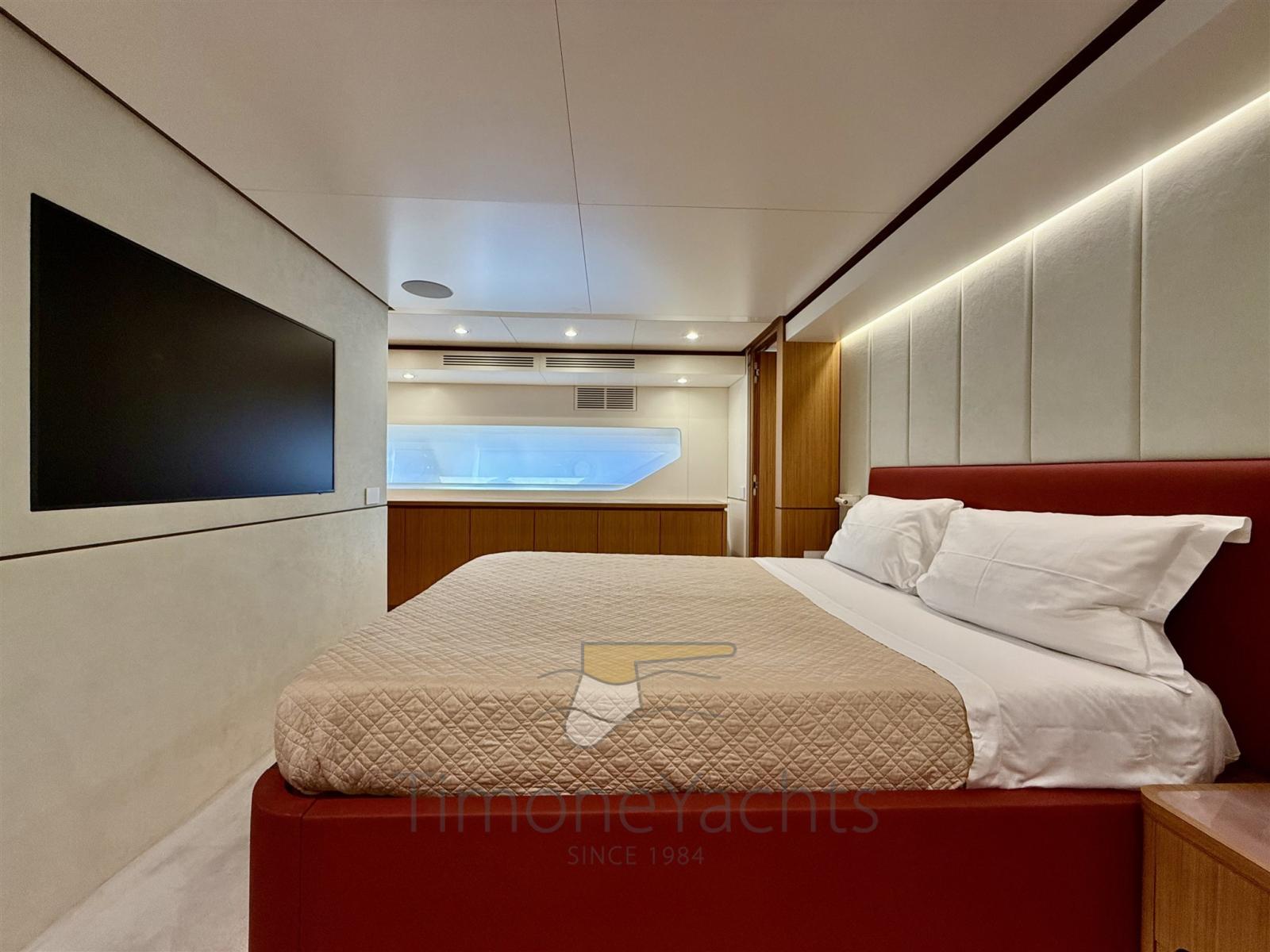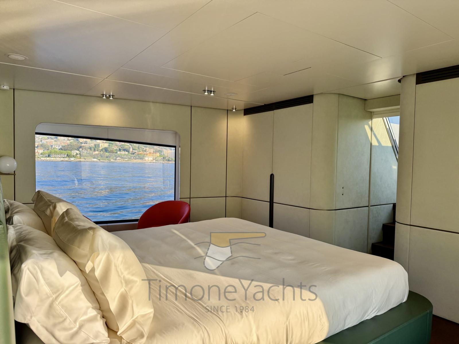 Tre stabilizzatori: giroscopio Seakeeper, pinne (in navigazione + zero speed), e il terzo? il terzo è nella cabina armatoriale dove, ebbene sì, anche il letto armatoriale è stabilizzato antirollio.