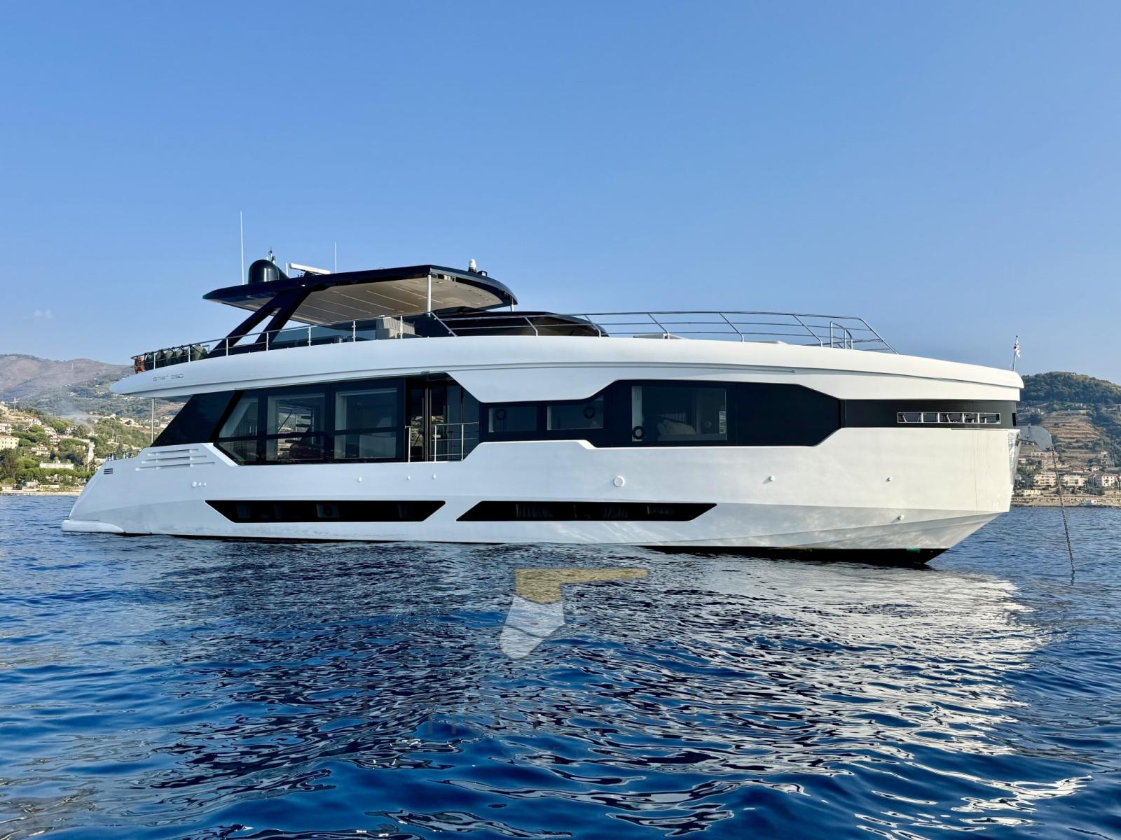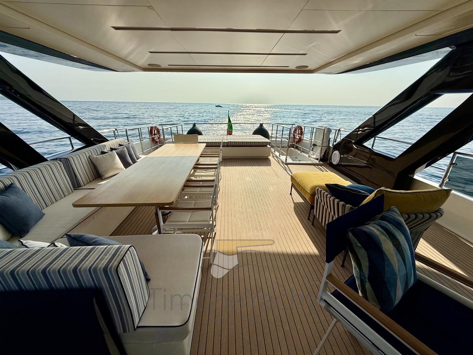Allarme fumo/gas, Allarme motore, Allarme sentina, Alternatore, Auto Dynamic Trim Interceptor, Autoclave, Auto-Trim, Camminamenti laterali in teak, Cavo corrente di banchina, Doccia esterna, Doppia timoneria, Faro orientabile, Flap idraulici, Garage per tender, Hard top, Impianto antincendio, Indicatori Flaps, Lavaggio catena, Luci di cortesia, Luci subacquee, Passerella, Piattaforma, Pompa Lavaggio Ponte, Ponte in teak, Porta ingresso, 2 Porta laterale, Pozzetto Teak, Presa 220V banchina, Presa acqua banchina, Salpa Ancore Elettrico, Stabilizzatori (Seakeeper 16\18 + Fins (zero speed + underway))), Tavolo pozzetto, Tender (Surmarine ST 400 Prestige 40 Cv Yamaha), Tientibene con cancelletti, Tromba, 2 Winch tonneggio di poppa, Winch tonneggio di prua.