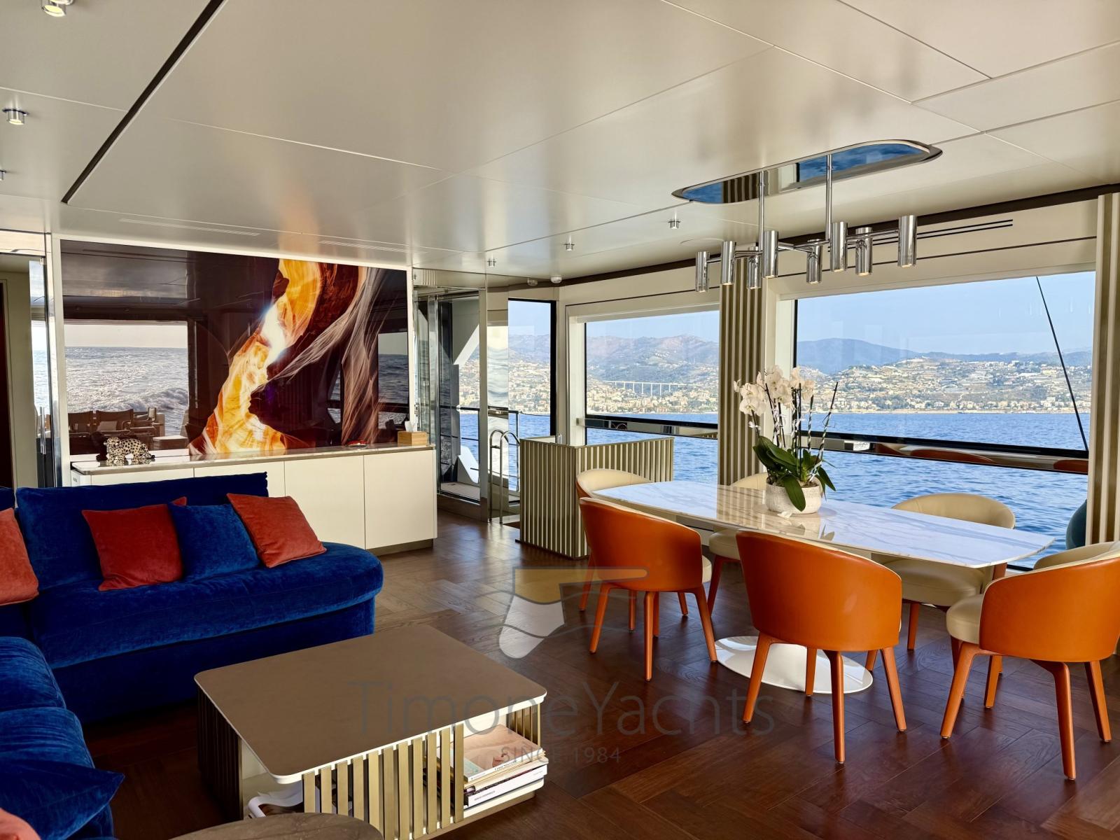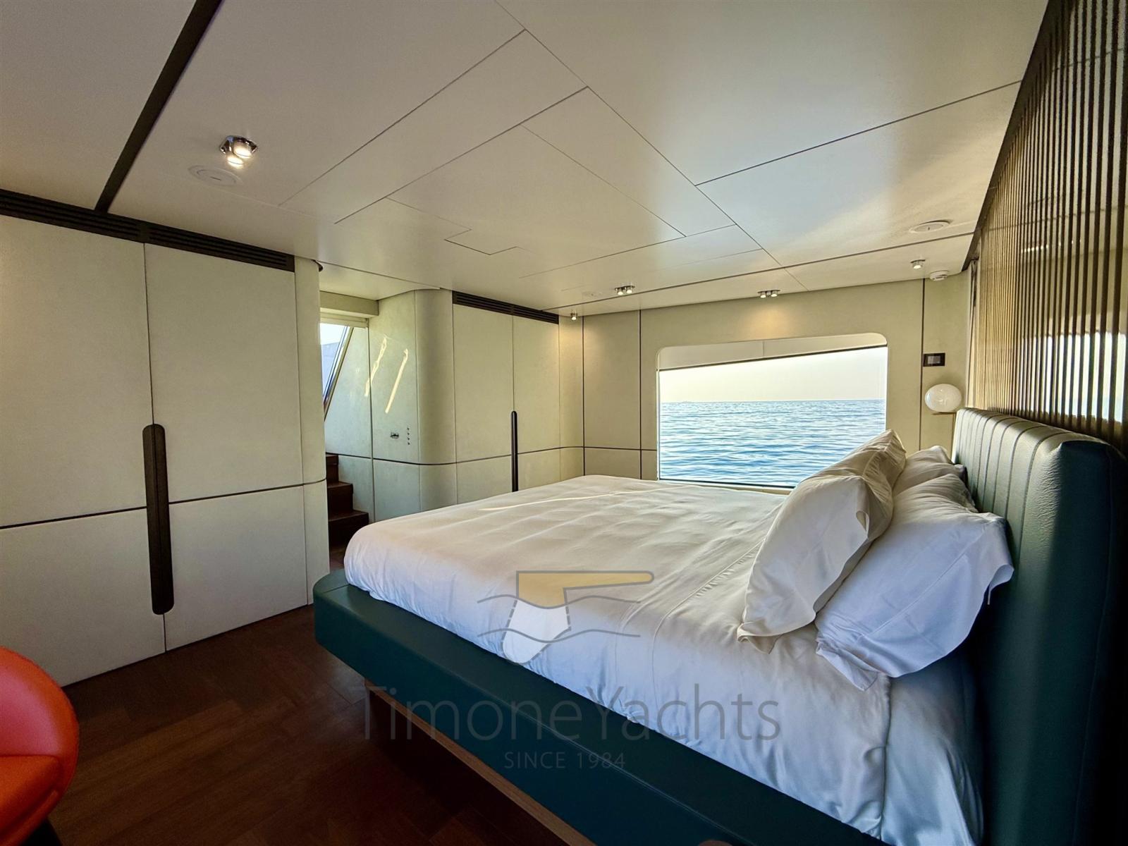Il salone principale è una villa sull'acqua, con finestre così grandi che sarà difficile distinguere l'interno/esterno. L'enorme salone ha due nicchie a centro nave, che favoriranno l'imbarco dei vostri ospiti con stile se ormeggiati "all' inglese". Al main deck c'è chiaramente l'appartamento master dove, ebbene sì, c'è una porta a vetri apribile elettricamente che porta sul ponte esterno anteriore. Per non considerare l'ampio corridoio d'ingresso con cui inizia l'area padronale.