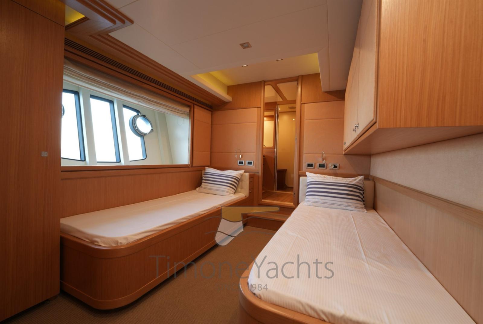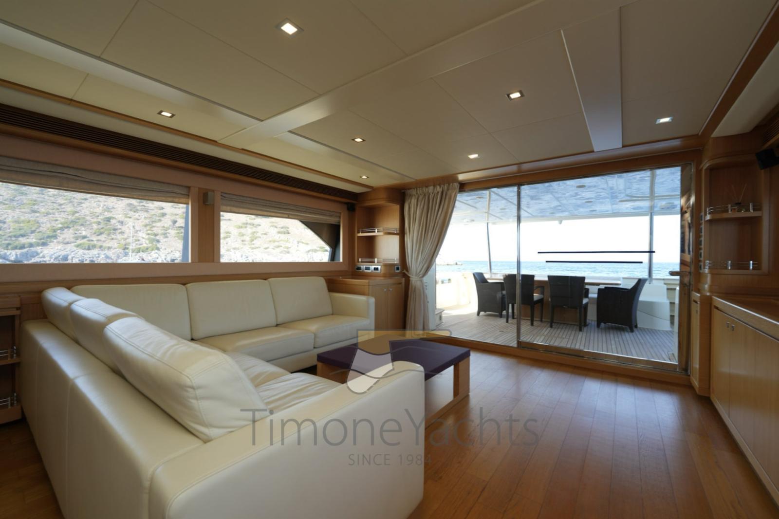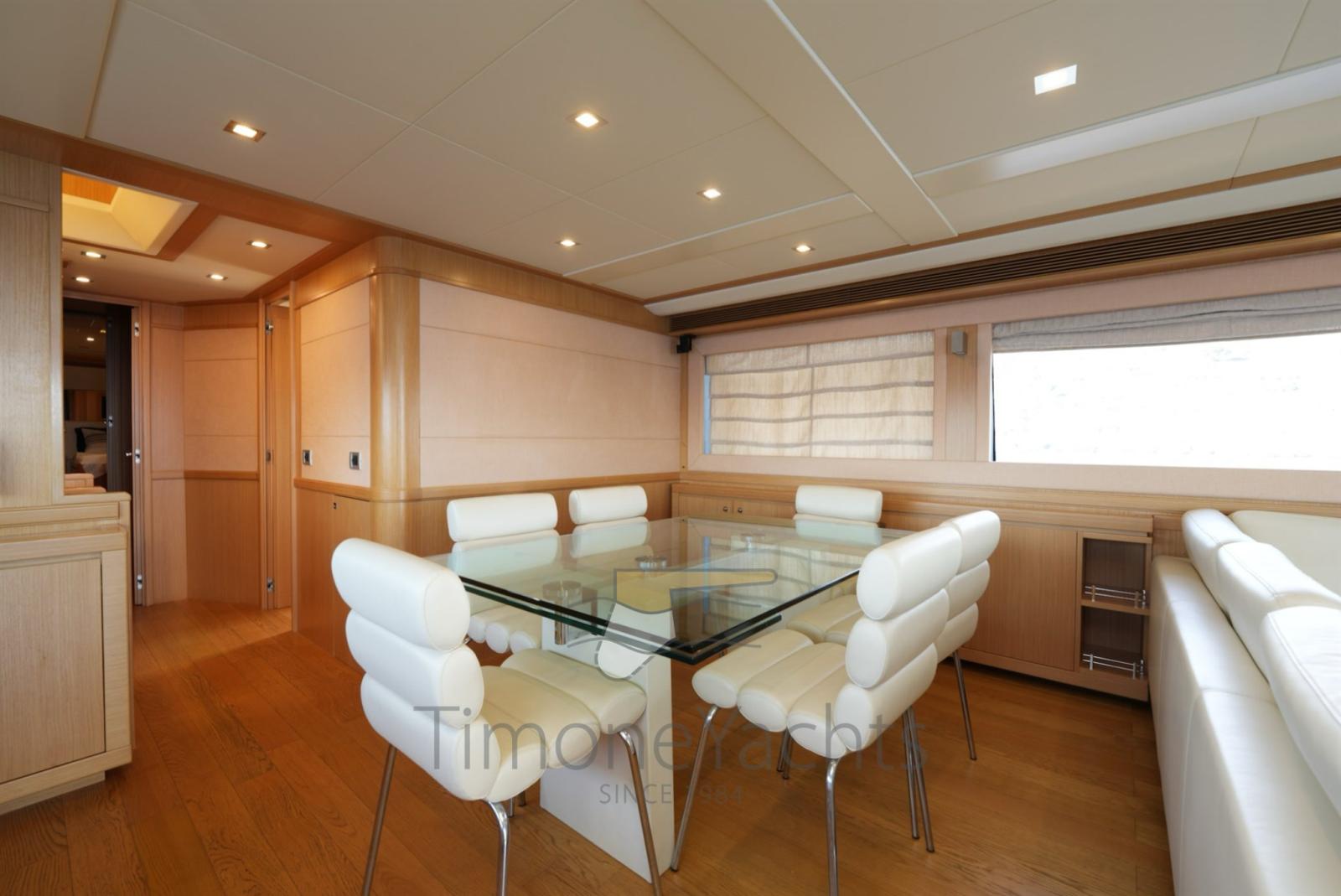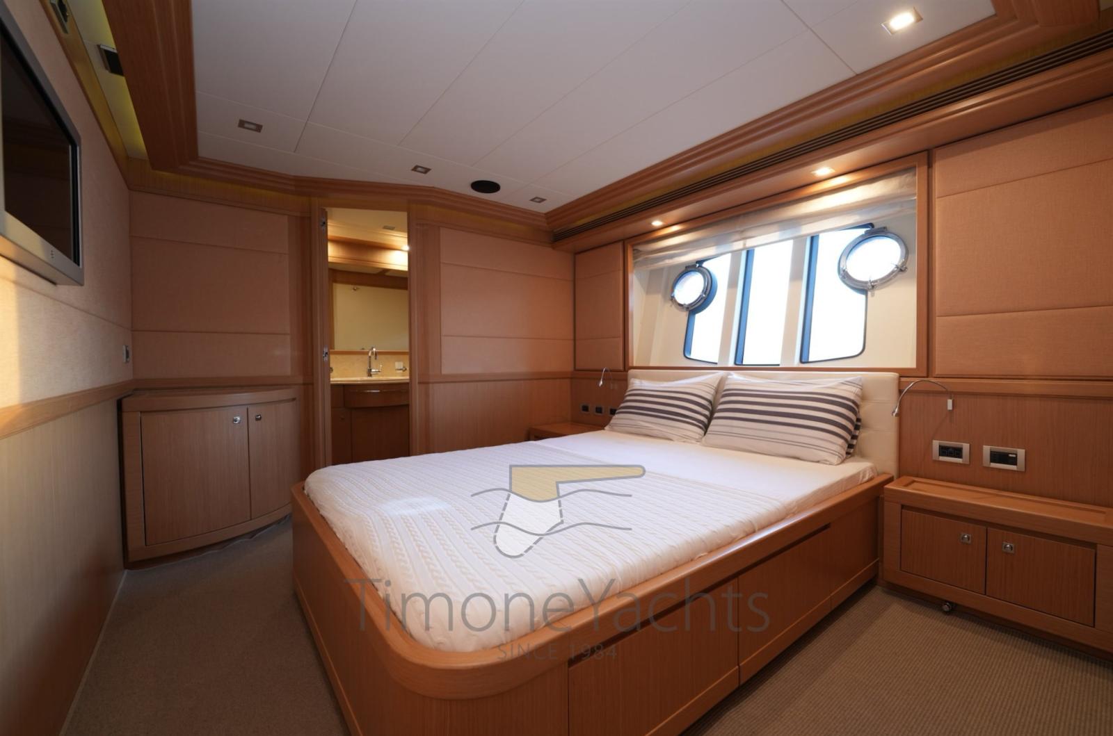 Bow thruster -Stern thurster - Tender Zodiac 490/Zodiac 320 - 2 x Outboard Evinrude 70HP/Jojnson - Windlass - Gallery 5 fire - Cockpit covering - Bimini top - Bow sun cushion - Cushions - Fridge - Freezer - Icemaker - Oven - Washing machine - Dish washer - DVD - Stereo sound system - Decoder SKY - Sat tv system - TV n° 8 - Water pump - Shore water plug - Chain counter - Garage - Stern mooring winch - Gangway - CD player - Leather sofa - Waste holding tank - Battery charger Mastevolt - Frige on fly - Grill on fly - Searchlight - Water heater - Teak platform - Teak cockpit - Teak sideways - Teak FLY - Glendening recovery system - Hamann waste treatment system - Teak cockpit + fly table - Salon wood floor - Nr. 2 additional mooring stations with tiller - Nr. 2 Gyro zero speed stabilizers.