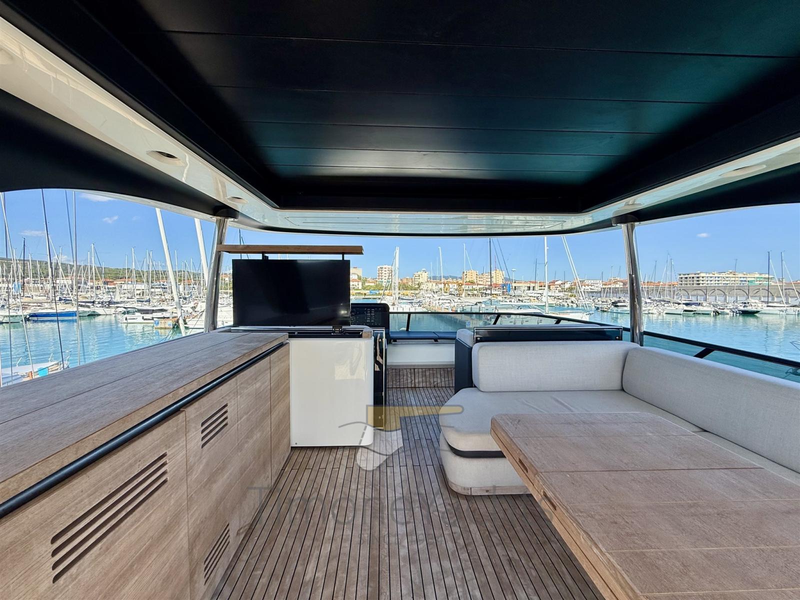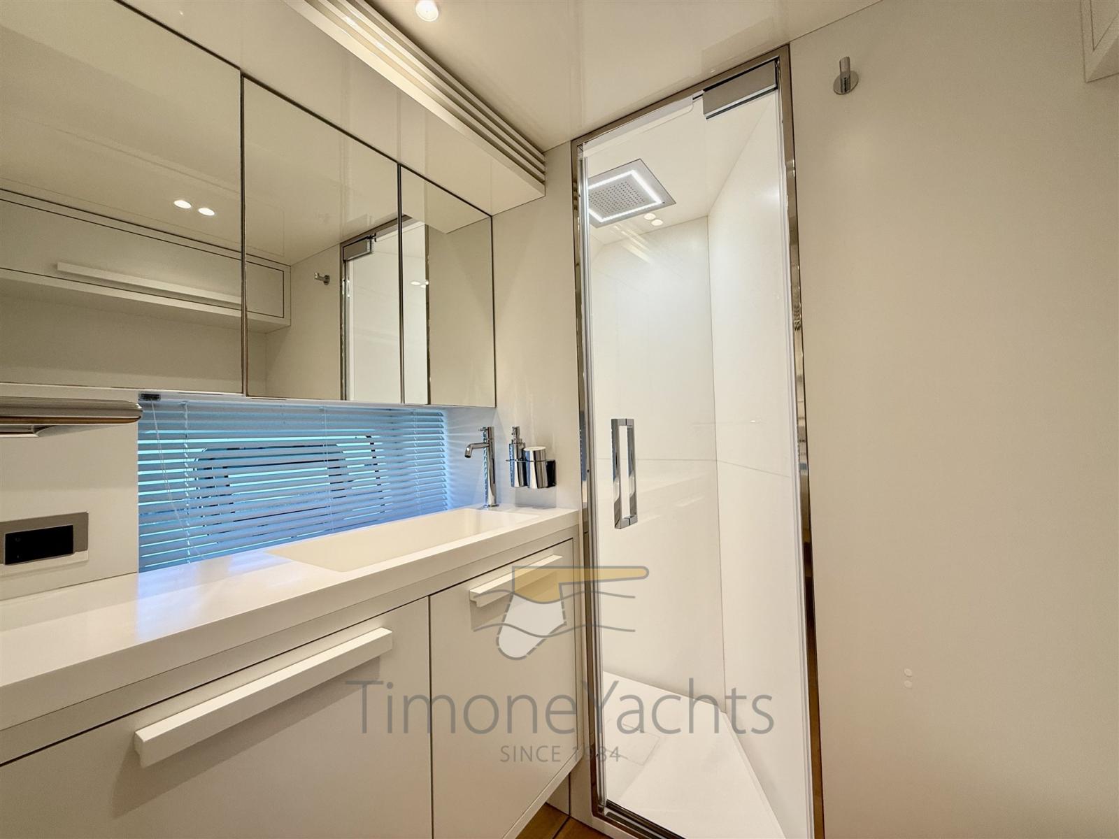 Allarme fumo/gas, Allarme motore, Allarme sentina, Alternatore, Auto Dynamic Trim Interceptor, Autoclave, Camminamenti laterali in teak, 2 Doccia esterna, Doppia timoneria, Flap elettrici, Garage per tender, Hard top (Con lamelle in alluminio regolabili), Impianto Aria Compressa, Lavaggio catena, Passerella, Piattaforma, Pompa di sentina automatica, Ponte in teak, Porta ingresso, Porta laterale, Pozzetto Teak, Presa 220V banchina, Presa acqua banchina, Salpa Ancore Elettrico, Scaletta da bagno, Stabilizzatori (Pinne stabilizzatrici), Tavolo pozzetto, Tromba, Winch tonneggio di poppa, Winch tonneggio di prua.