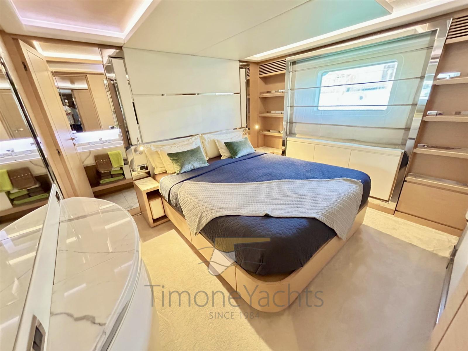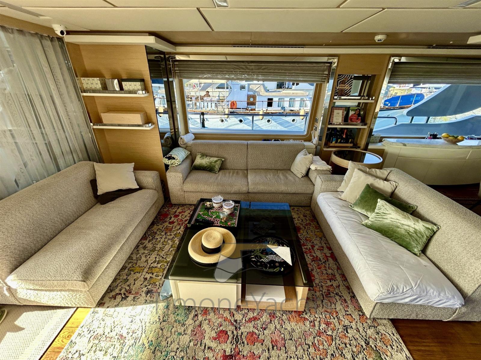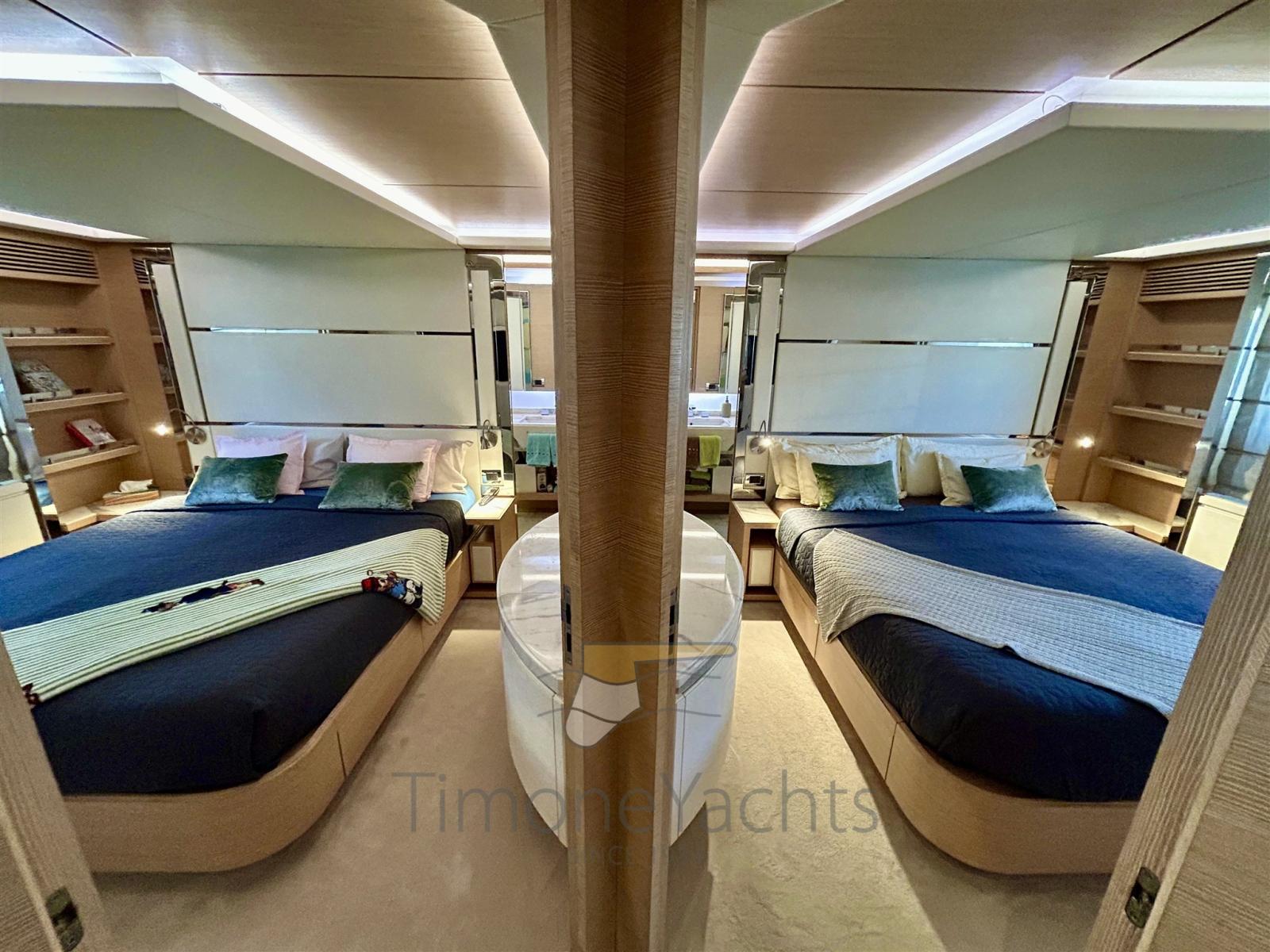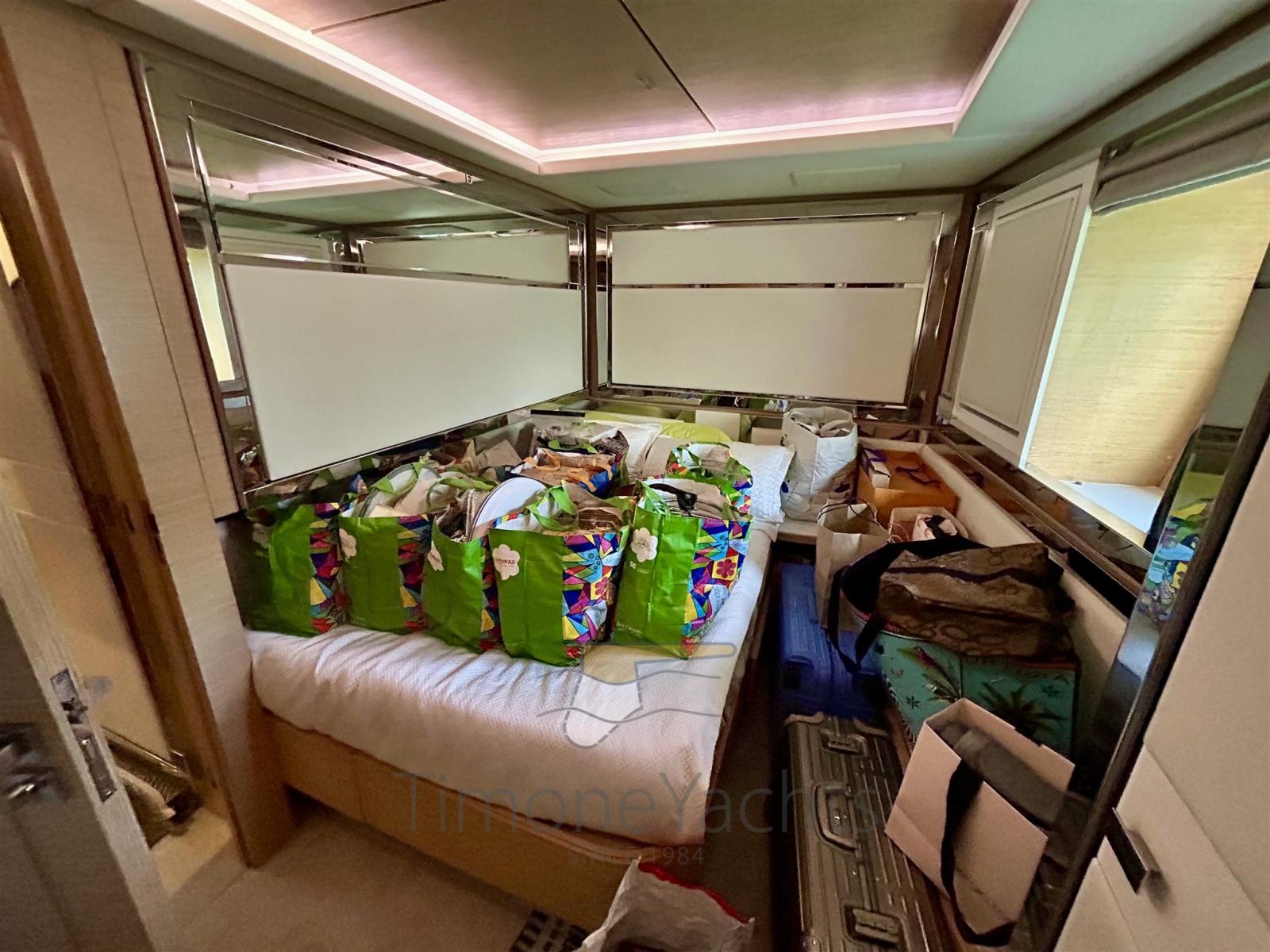 Allarme fumo/gas, Allarme motore, Allarme sentina, 2 Ancora, Autoclave, 2 Autogonfiabile, Bocche di Lupa, Camminamenti laterali in teak, Cavo corrente di banchina, Doccia esterna, Doppia timoneria, Garage per tender, Hard top, Impianto antincendio, Impianto Aria Compressa, 2 Lavaggio catena, Luci di cortesia, Luci subacquee, Monitor batteria, Passerella, Pompa di sentina automatica, Pompa di sentina manuale, Pompa Lavaggio Ponte, Ponte in teak, Porta ingresso, 2 Porta laterale, Pozzetto Teak, Presa 220V banchina, Salpa Ancore Elettrico, Scala reale, Stabilizzatori (Fins, electric (underway + zero speed)), Tavolo pozzetto, Tientibene con cancelletti, Tromba, Winch tonneggio di poppa, 2 Winch tonneggio di prua.