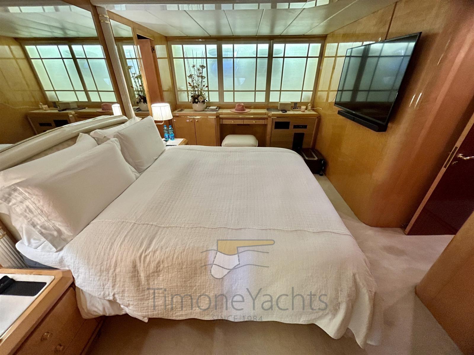 This 1995 Mangusta 92 is surprisingly still in her first Owner's hands. And during my inspection it was quite easy for me to understand why he kept the unit so long. We're in front of a pure open boat, with the bliss of stern sunpads and airy cockpit, naturally voted for entertaining in style right overwater. But yet the interiors benefits of the comfort that a large motoryacht can offer. The interior salon is lowered and reminds of the one coming (many) years later on the Mangusta 130.