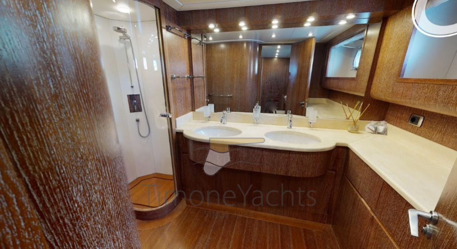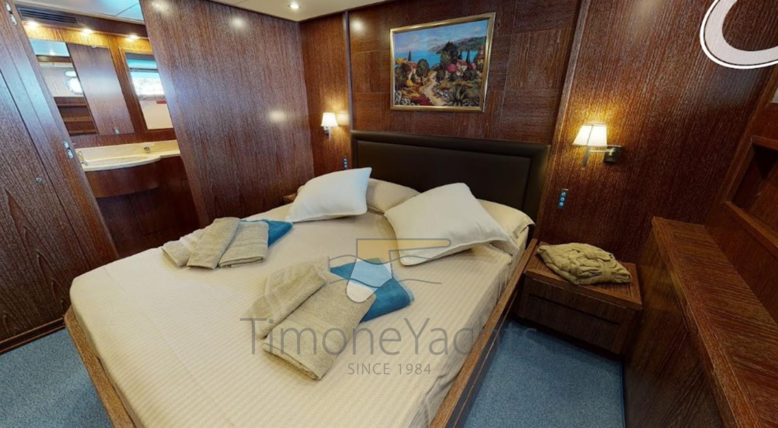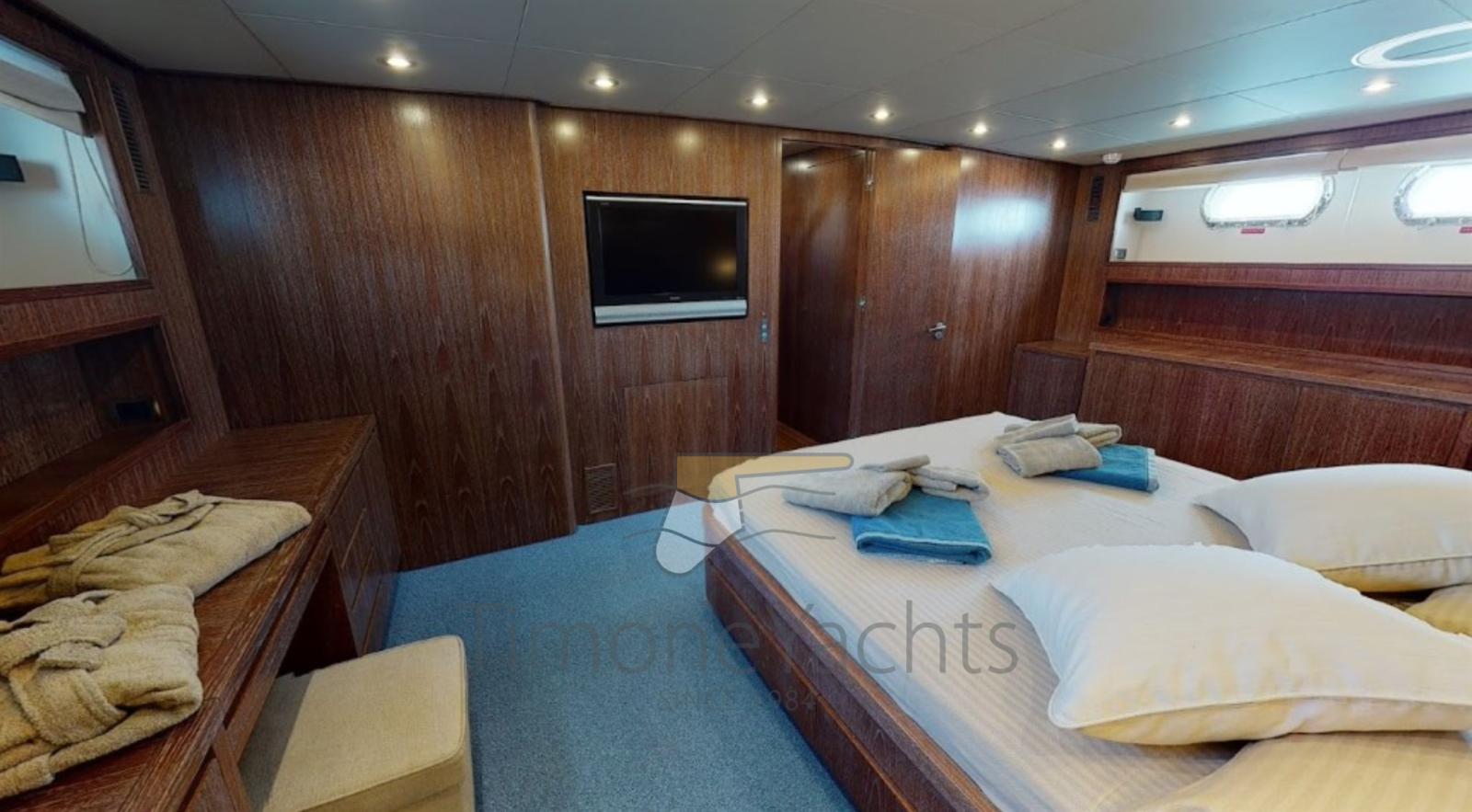 Spectacular fiberglass AKHIR 85, day head on main deck, TRAC fins stabilizers (zero speed + underway), up/down platform astern, jacuzzi on fly. Private Vessel, EU vat paid, pleasure craft. 4 cabins with ensuite.