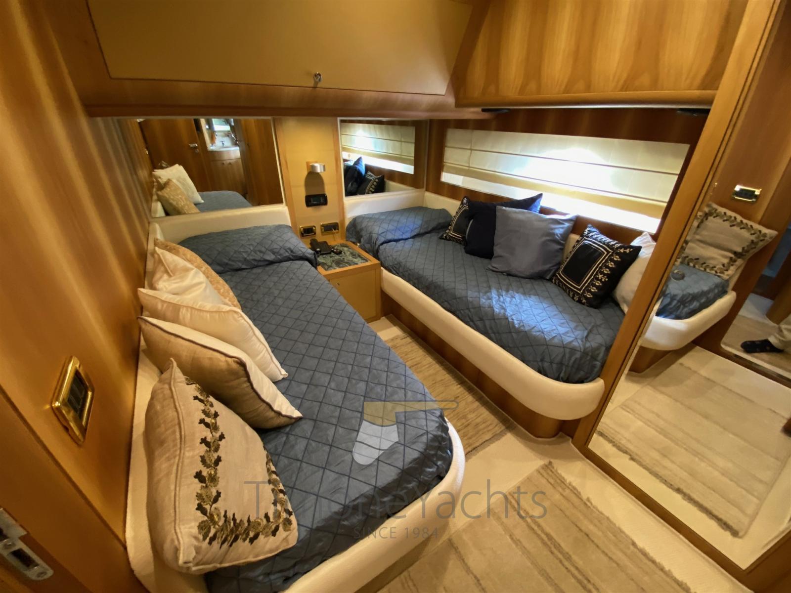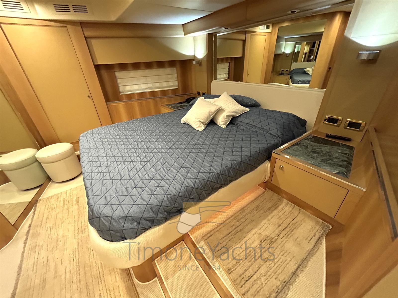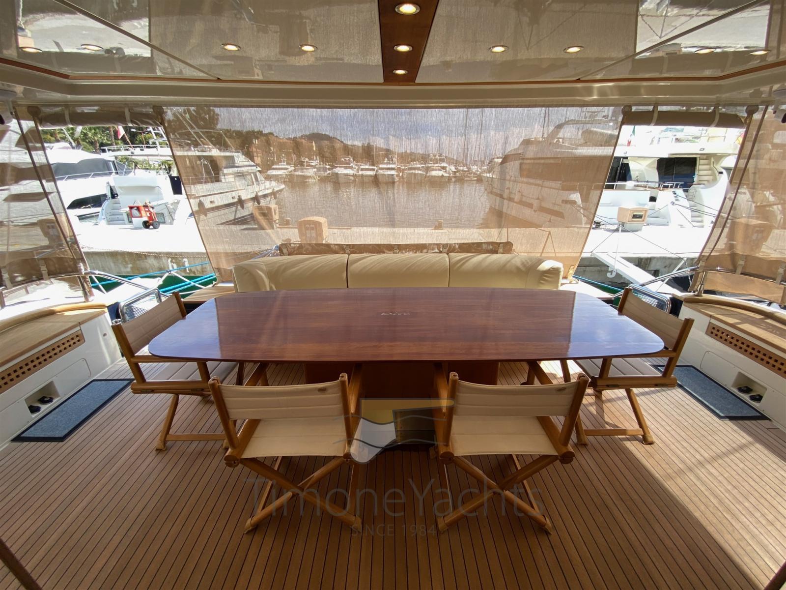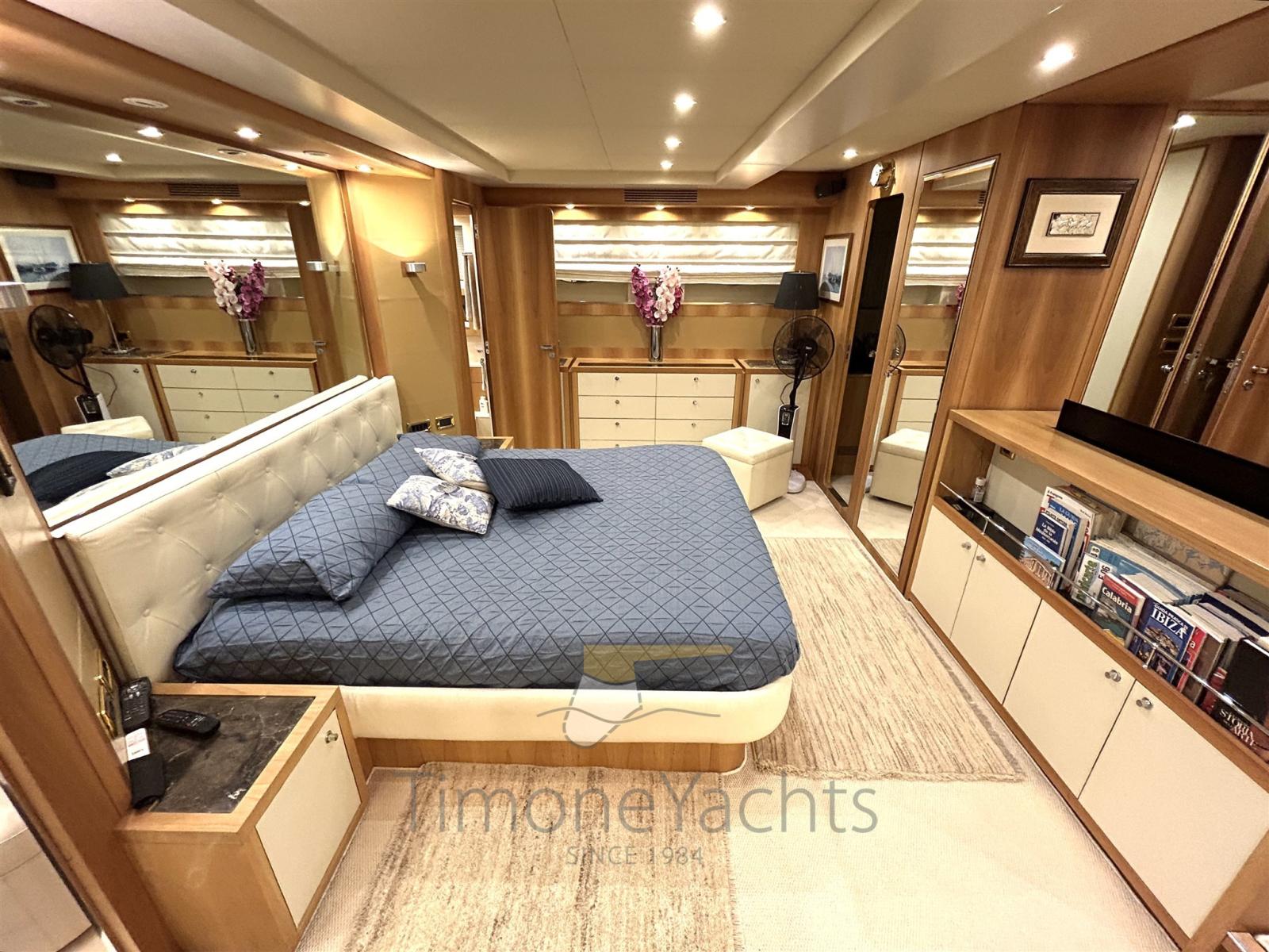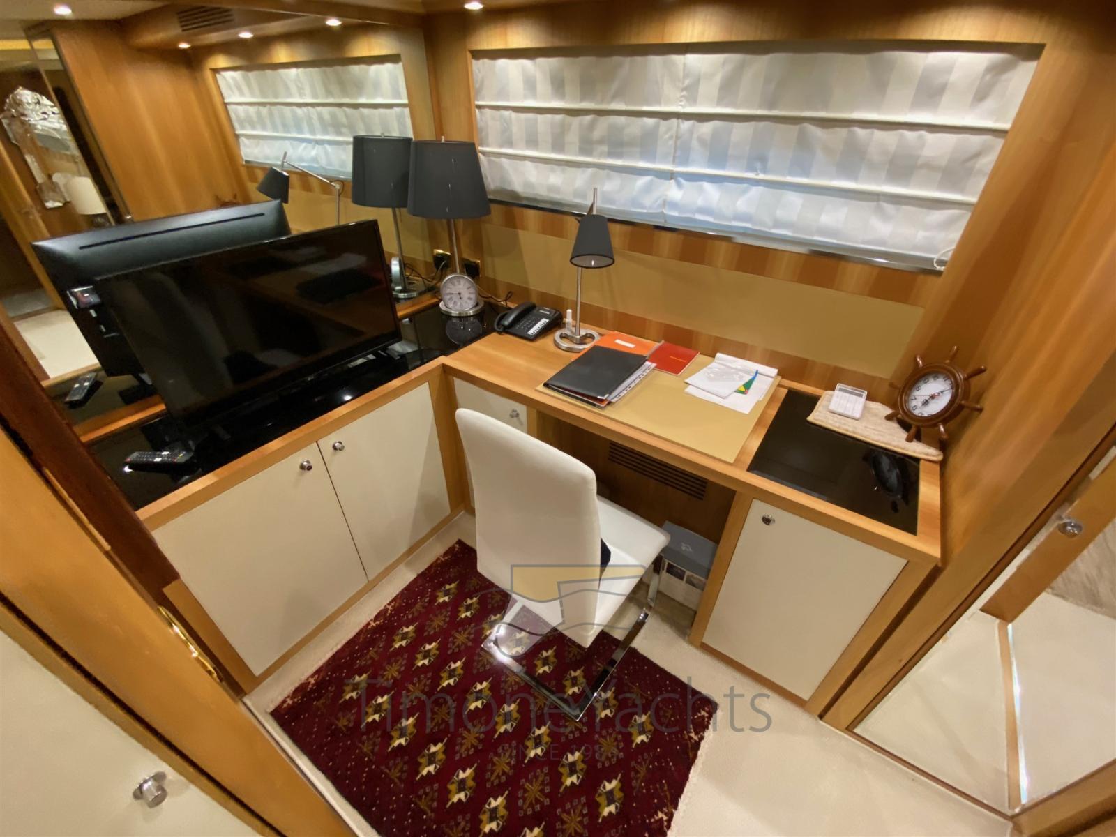 Up/down hydraulic platform at transom realized as a work of art for a more spacey flybridge free from crane astern. Spectacular master cabin amidship out of a 3 guests cabin layout (from origin): the stbd guest cabin area has been split partly as loundry utility room (with washer and dryer with separate units) and partly for master cabin's office. Day toilet on main deck. New teak 2021. New navigation equipment 2023.