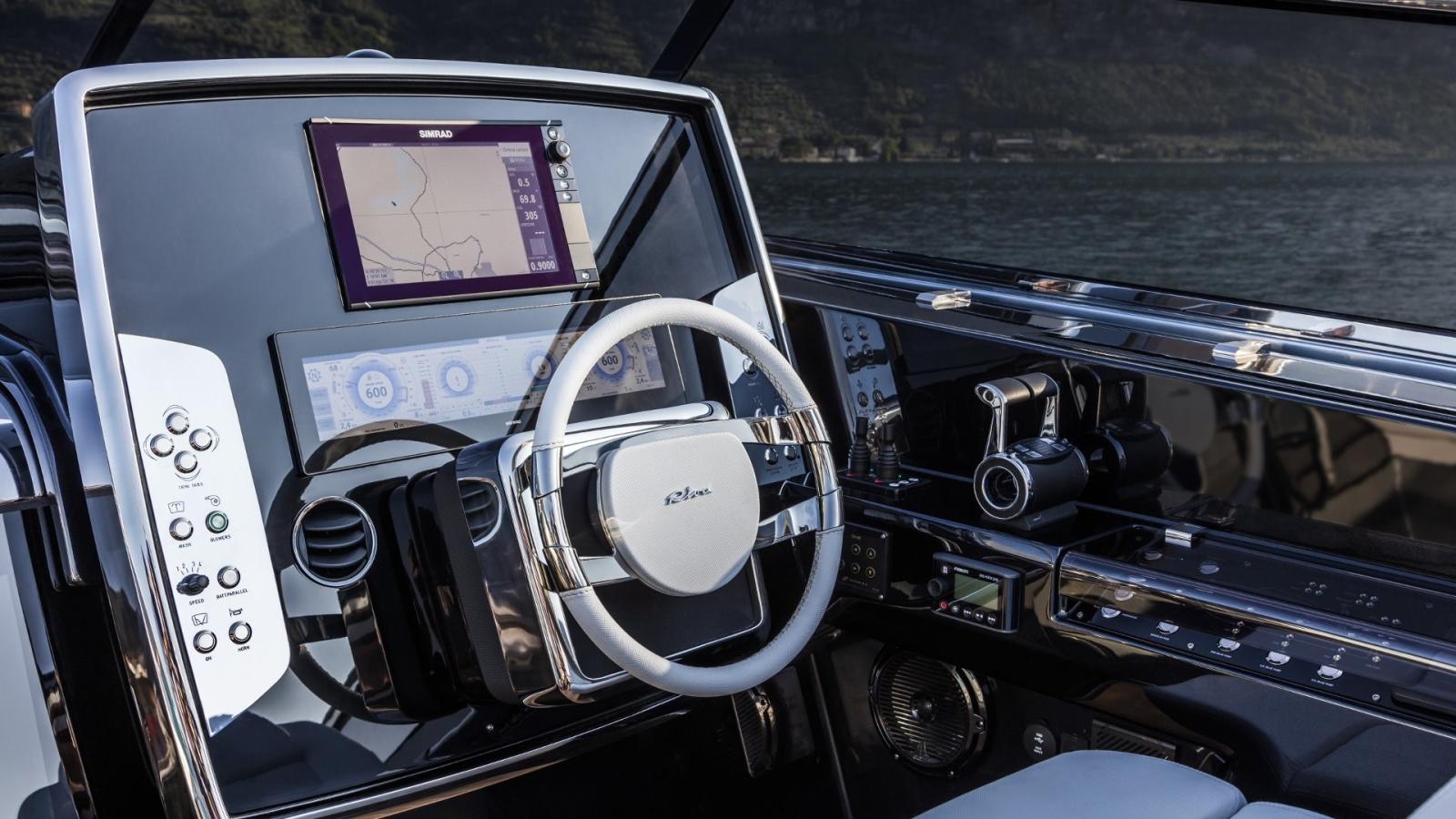 Comando motori elettronico (MANN), Computer di bordo (MANN), Contamiglia (MANN), Ecoscandaglio (Simrad), GPS (Simrad), Joystick, Monitor dei consumi, Pilota automatico (Simrad), Plotter con antenna GPS, Sedile Copilota.