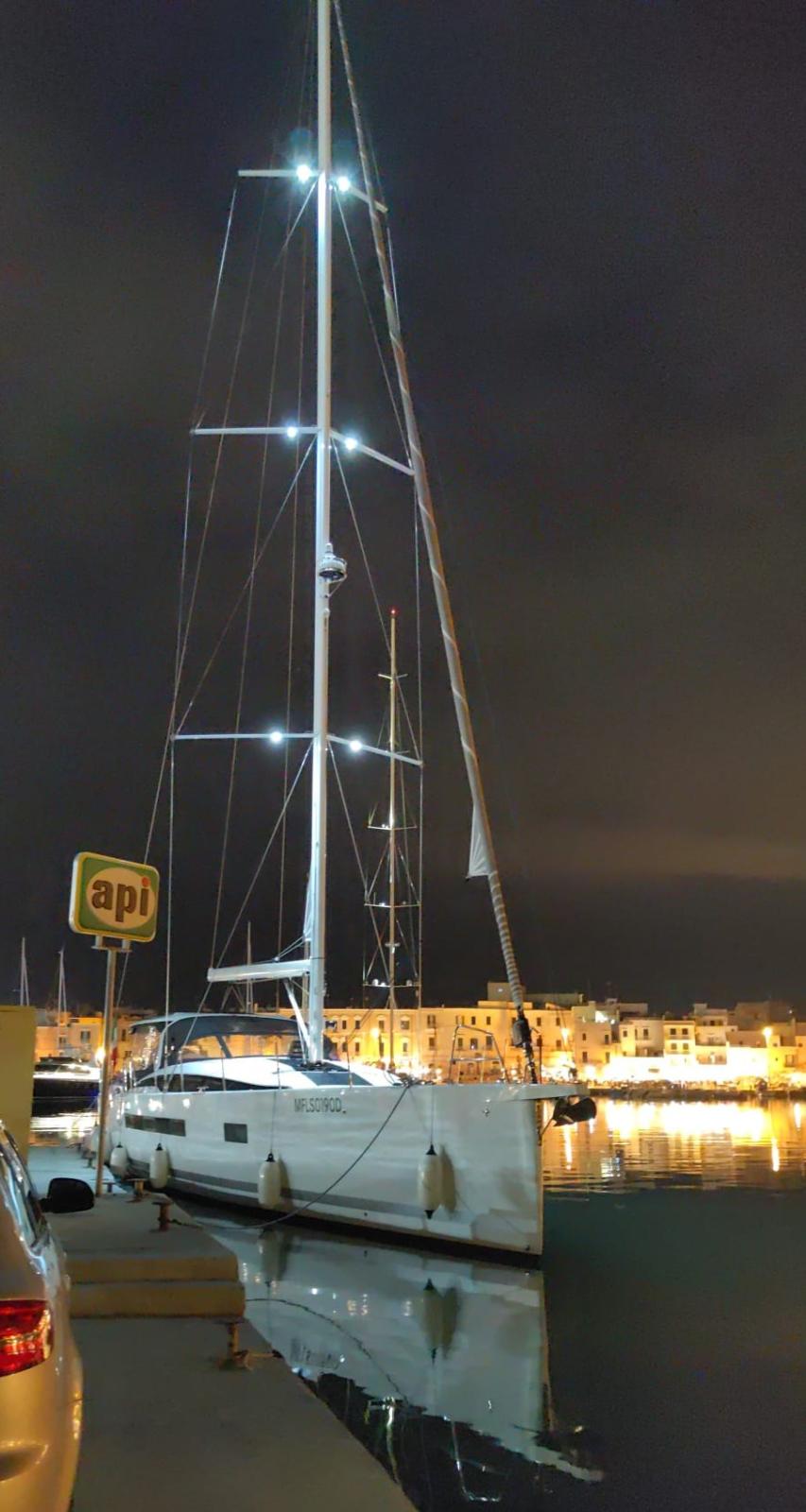 AIS (Raymarine), Antenna radar, Comando motori elettronico, Computer di bordo, Contametri catena, Display, 2 GPS (Raymarine Axiom), Pilota automatico (Raymarine), Plotter con antenna GPS, Radar (Raymarine Quantum), 2 Radio VHF (Raymarine Ray90).