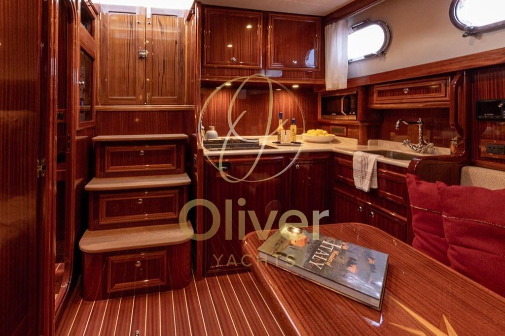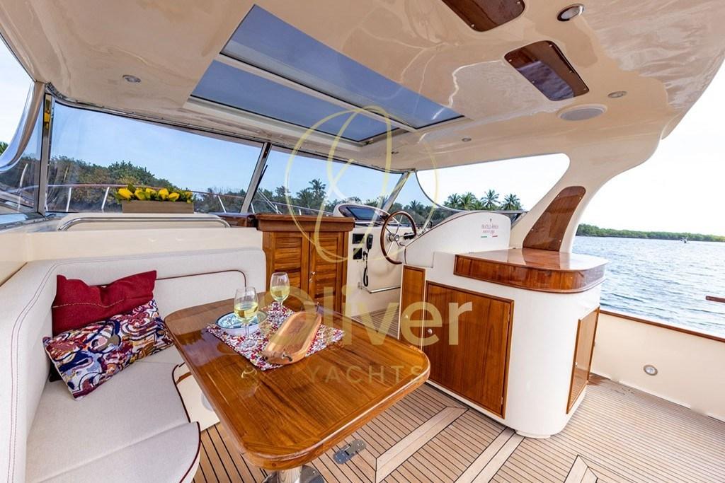 Esternamente spiccano il teak su coperta e pozzetto, la passerella idraulica, la piattaforma di poppa generosa e il secondo angolo cucina esterno con piastra in vetroceramica e lavabo. Il pozzetto è protetto da hard top con tettino apribile scorrevole, soluzione che consente ventilazione naturale e utilizzo versatile in ogni stagione.