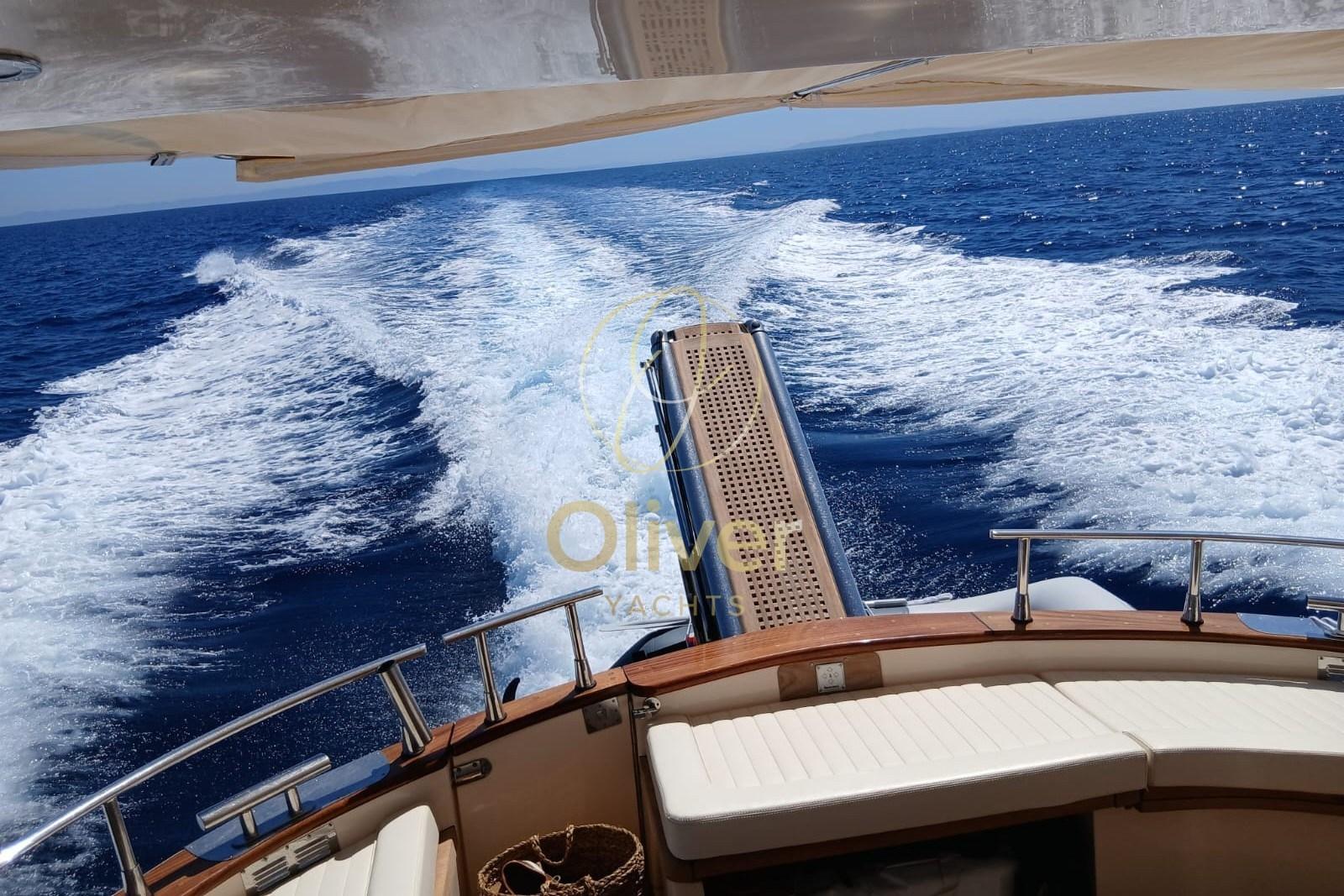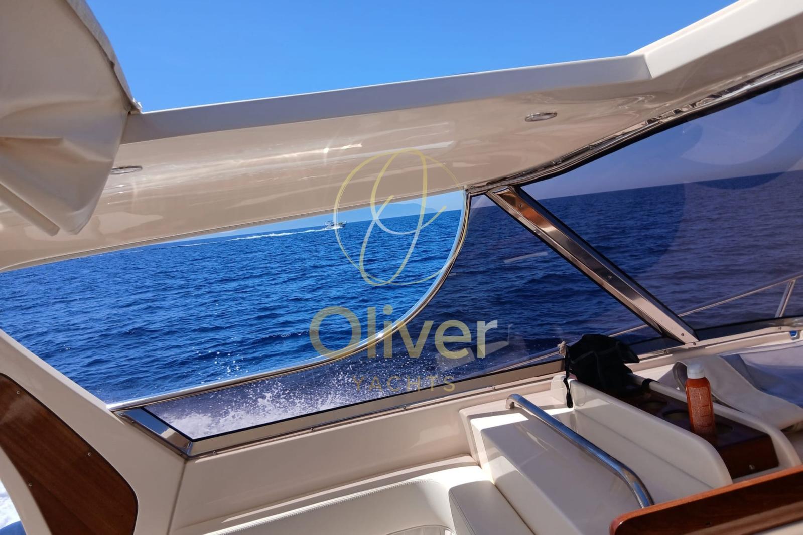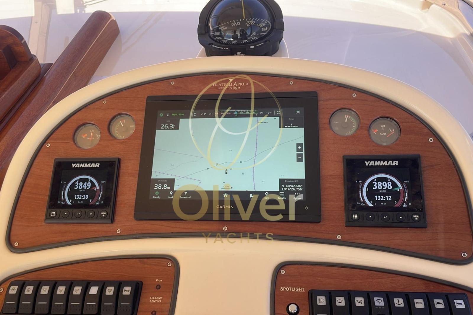 La barca è equipaggiata con bow thruster, flap idraulici, generatore 5 kW, aria condizionata, strumentazione completa Garmin (GPS, plotter, pilota automatico, VHF) e dotazioni di sicurezza entro 50 miglia.