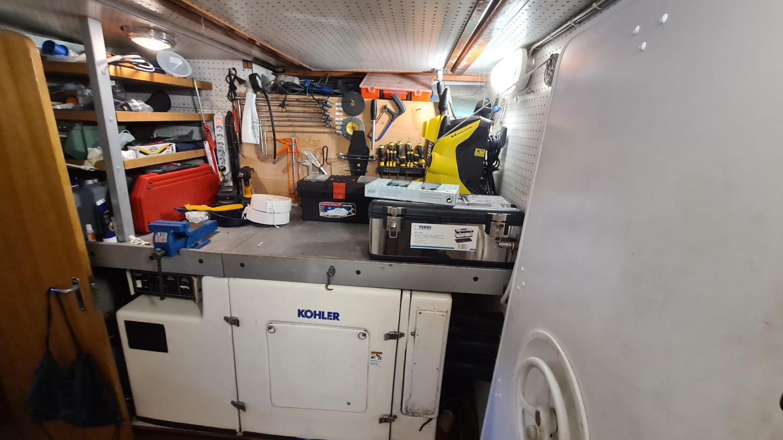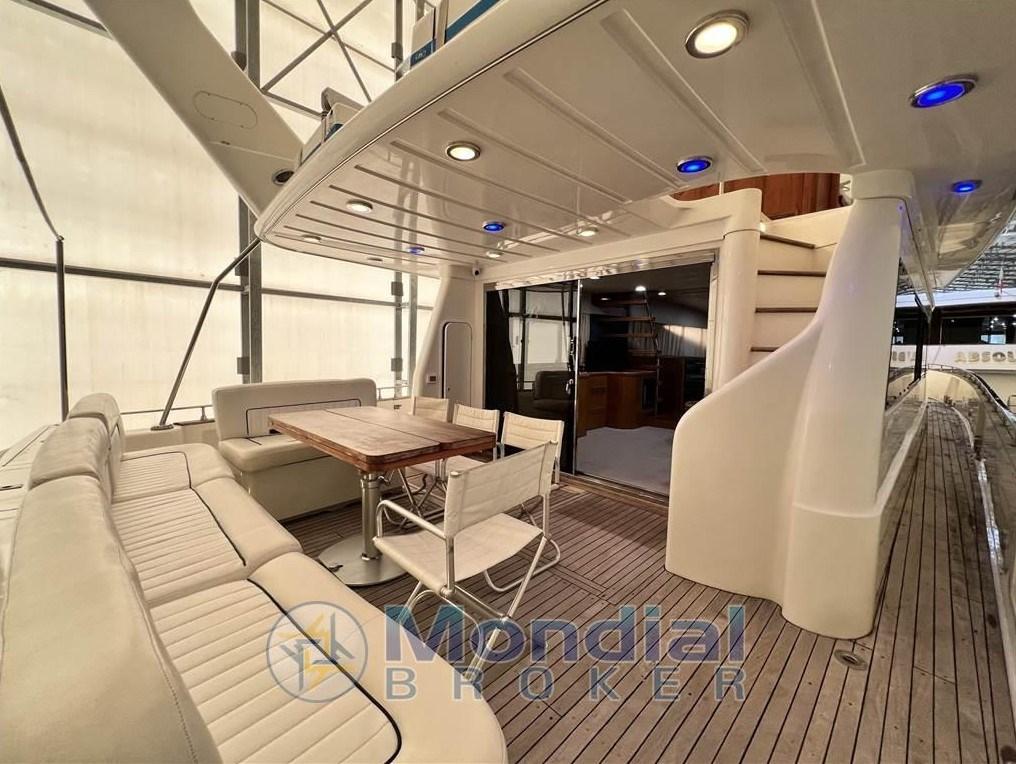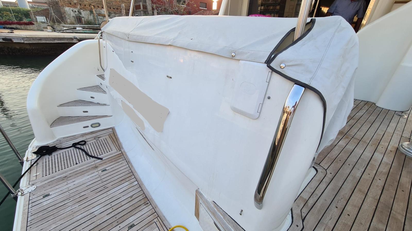Allarme motore, Allarme sentina, 2 Asse di rispetto, Autoclave, Batterie (2022), Camminamenti laterali in teak, Caricabatterie (2022), Doccia esterna, Elica di poppa - stern thruster (revisionata), Elica di prua - bow thruster (revisionata), Faro orientabile, 2 Flap idraulici, Gruette per tender su fly (Besenzoni), Impianto antincendio, Indicatori Flaps (impianto nuovo 2022), Luci di cortesia, Passerella (idraulica), Piattaforma, Pompa di sentina automatica, Pompa di sentina manuale, Porta ingresso, Pozzetto Teak, Presa 220V banchina, 2 Raddrizzatore (2022), Rollbar (con faretti nuovi), Salpa Ancore Elettrico (revisionato e nuova ancora), Scaletta da bagno, Tavolo pozzetto, Tender, Tromba, 3 Winch.