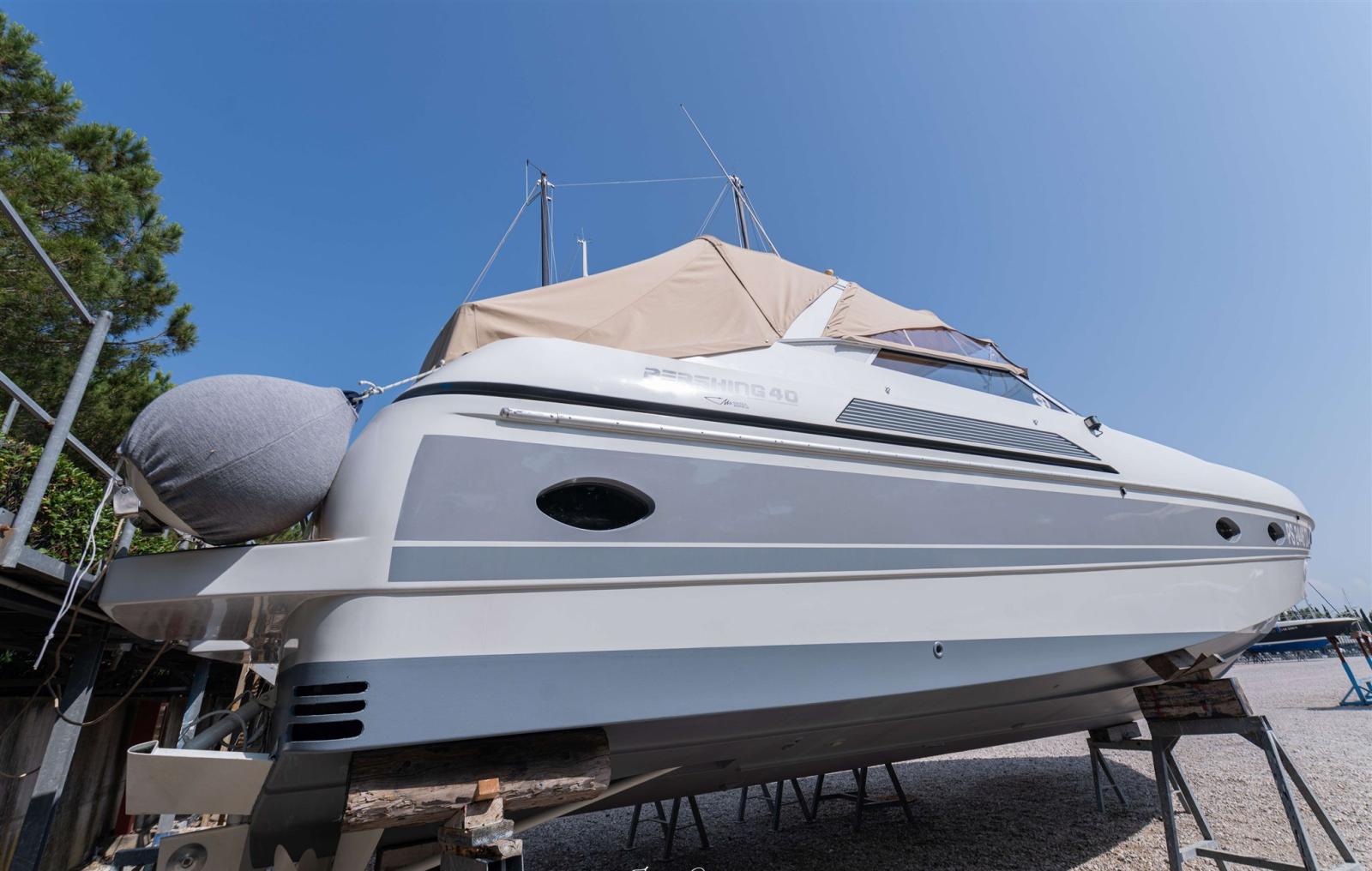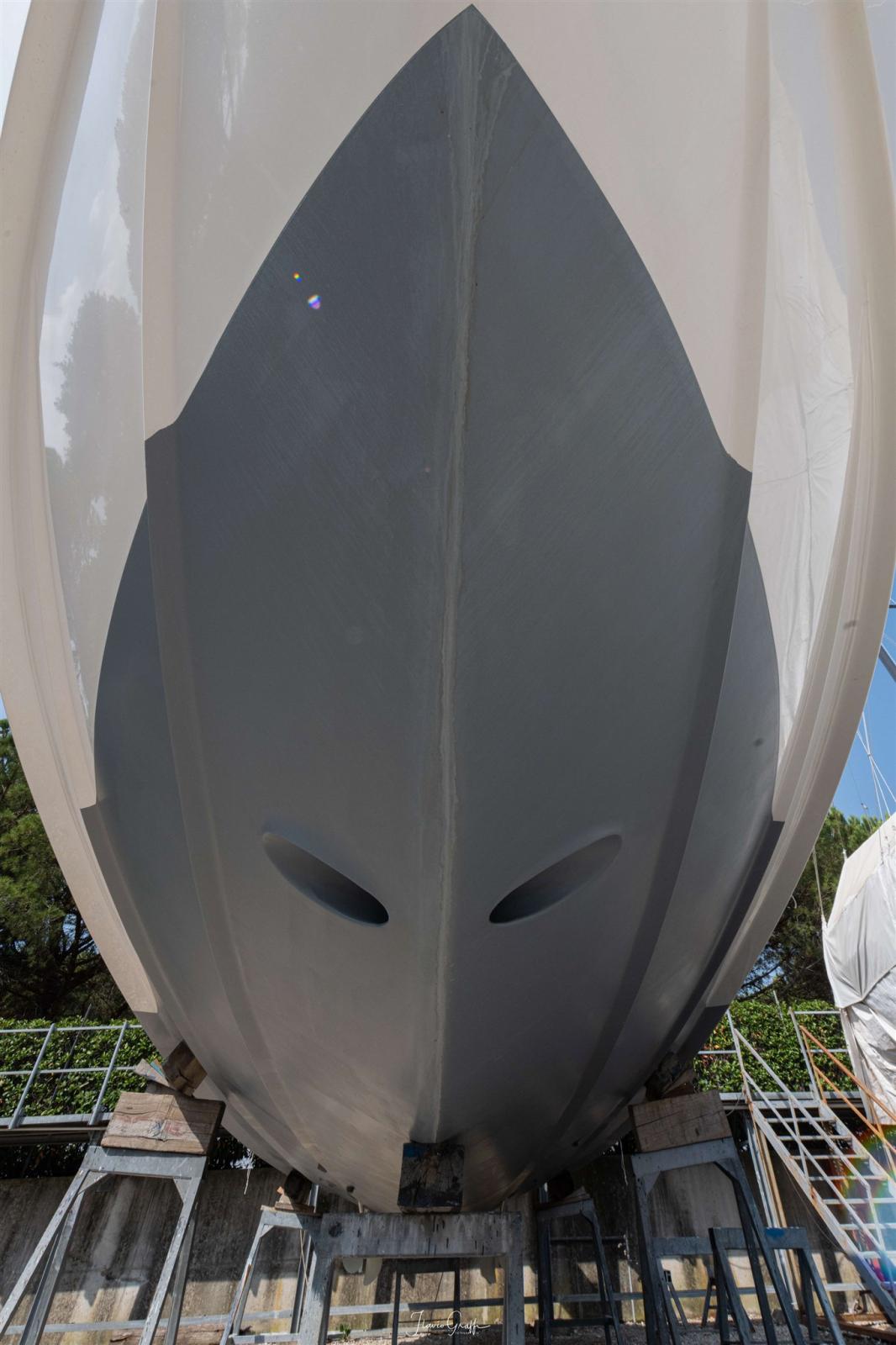 SCAFO: completamente riverniciato bianco/grigio CARENA: revisionata totalmente, rimosse le vecchie antivegetative, fatto il controllo Osmosi negativo, applicato 3 mani di gelshid (primer) e applicata 2 mani di antivegetativa. FASCIAMI: Controllati i vari govoni. SENTINE: di tutte le sentine totale poppa, sala macchine, parte centrale e prua. OPERA VIVA: lucidatura a tutte le parti VTR e Alluminio, 2021 sostituzione dell’oblò sopra la stanza dell’armatore e metà del soffitto interno. PULIZIE: Pulizie interne, pulitura della cuscineria, divani, materassi e tintura con olio per il teak e sistemazione profili teak ELICHE E ASSI: Revisionati e verificati per la rotazione perfetta. Trasmissione in asse. TIMONI: Revisionati FLAP: Revisionati i pistoni ELICA di PRUA: Installata propulsore CT125 Max Power 115kg di spinta, per barche dai 13 ai 26 mt, questo per avere maggiore potenza in caso di venti molto forti. PARTI ELETTRICHE: Fatto un controllo globale di tutte le parti elettriche, dalle luci per la navigazione, agli strumenti collegati al motore come temperatura acqua, carburante, olio, contagiri. Installati n. 2 conta-ore nuovi, cambiato il sistema di luci al led.