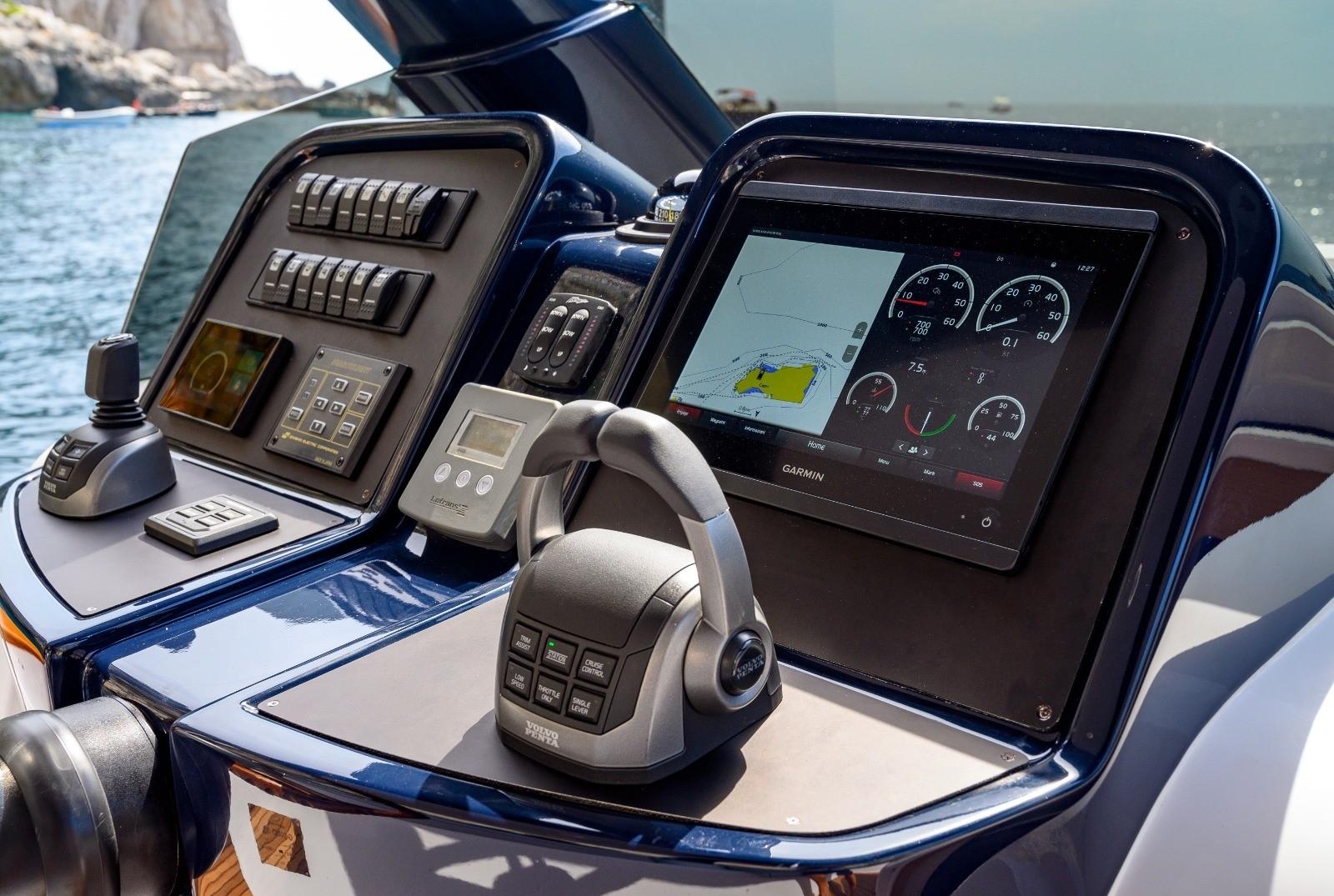 Angolo barra, Display, Ecoscandaglio (Dieptemeter), Indicatore di virata, Joystick, Mappe e guide, Quadro comandi, Strumenti di misura per motori.