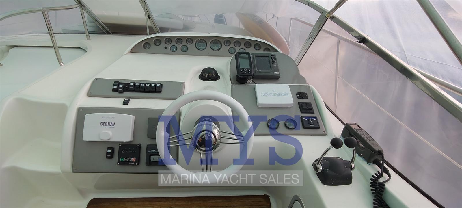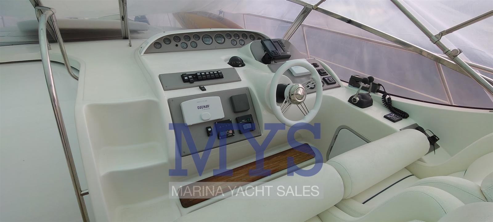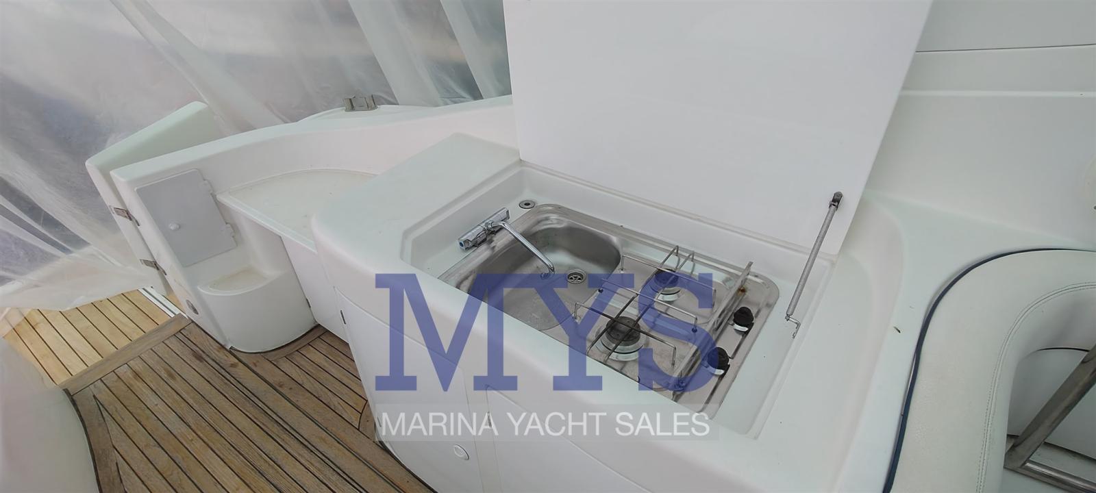 Allarme motore, Allarme sentina, Alternatore, Apertura Vano Motore Elettrica, Autoclave, Cavo corrente di banchina, Corrimano, Doccia esterna, Flap idraulici, Indicatori Flaps, Lavandino nel Pozzetto, Luci di cortesia, Luci subacquee, Passerella (elettrica), Piattaforma, Pompa di sentina automatica, Porta ingresso, Pozzetto Teak, Presa 220V banchina, Rollbar, Salpa Ancore Elettrico, Scaletta da bagno (elettrica), Tavolo pozzetto, Tromba, T-Top.