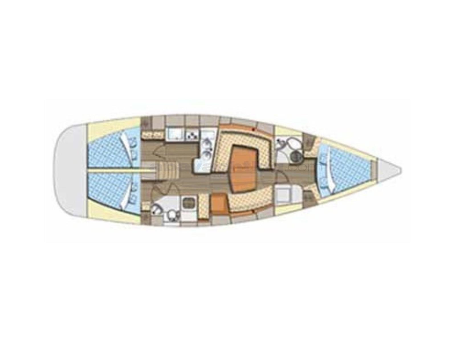Elan 434 Impression usato. Layout: 3 cabine e 2 bagni con doccia separata nella cabina armatoriale.