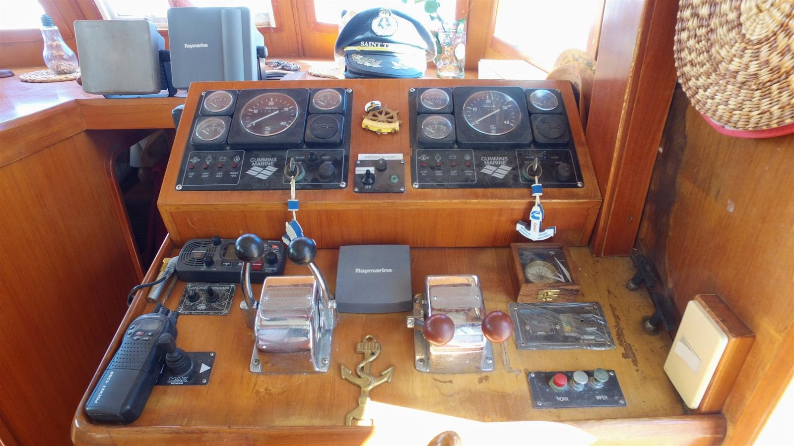 Antenna radar, Pilota automatico (Raymarine ST500), Plotter con antenna GPS (Raytheon L760), Radar (Raytheon R70 à reviser), Radio VHF (portable RO 4800), Sonar, Strumenti di misura per motori.