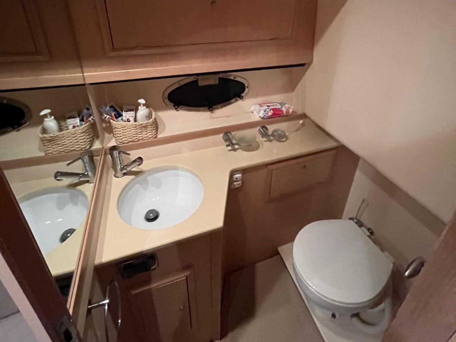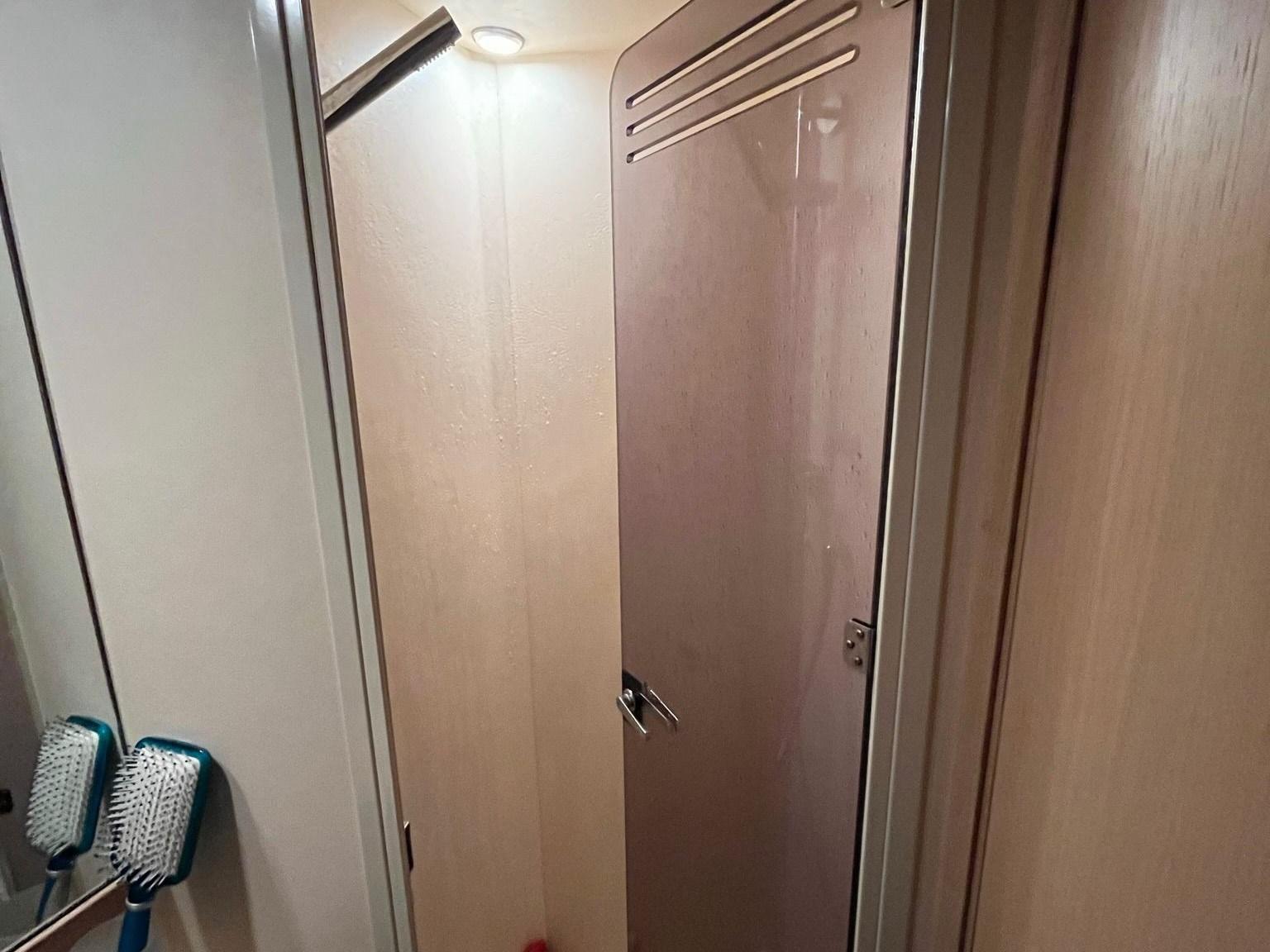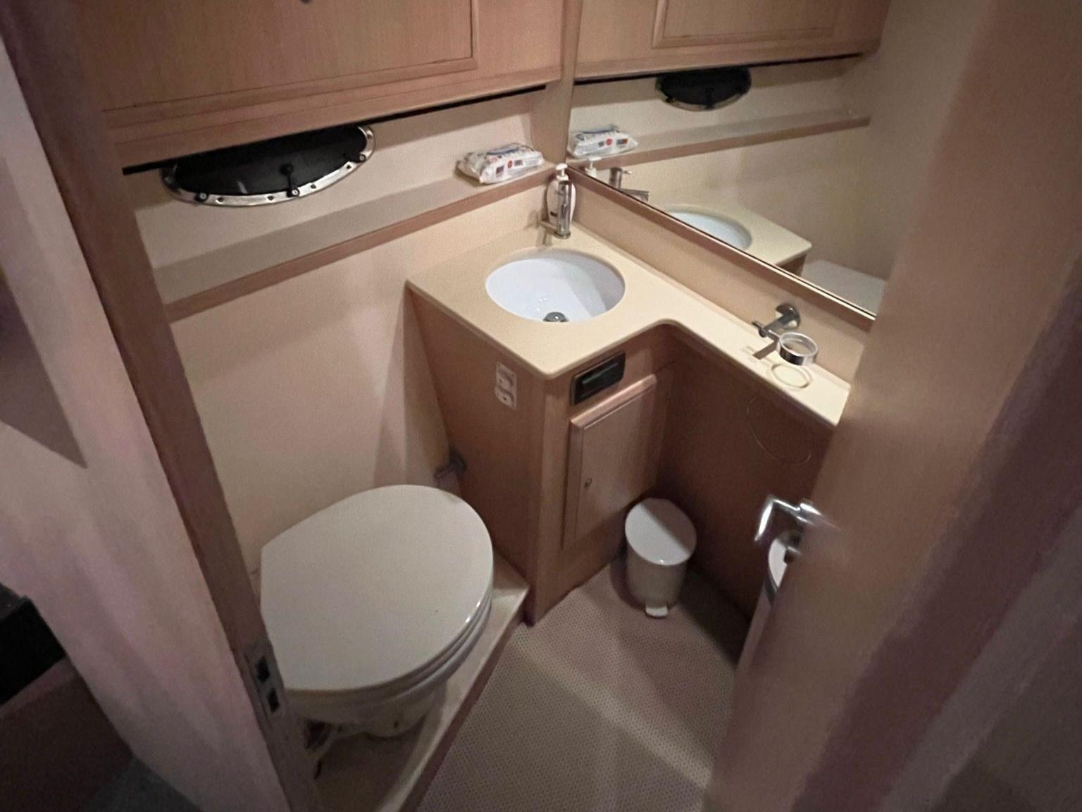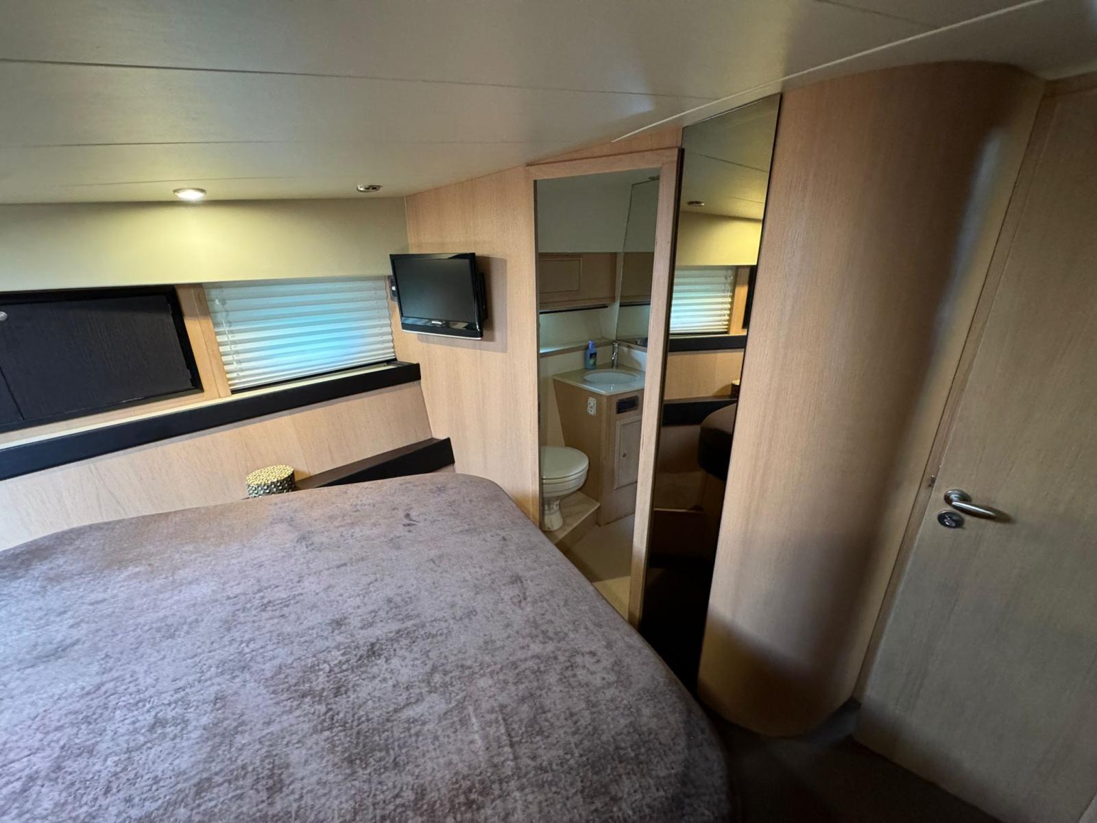 Cabina Armatoriale a V di prua con letto matrimoniale centrale, ampi armadi, cassettiere e accesso diretto a un bagno privato completo di WC elettrico e doccia separata.