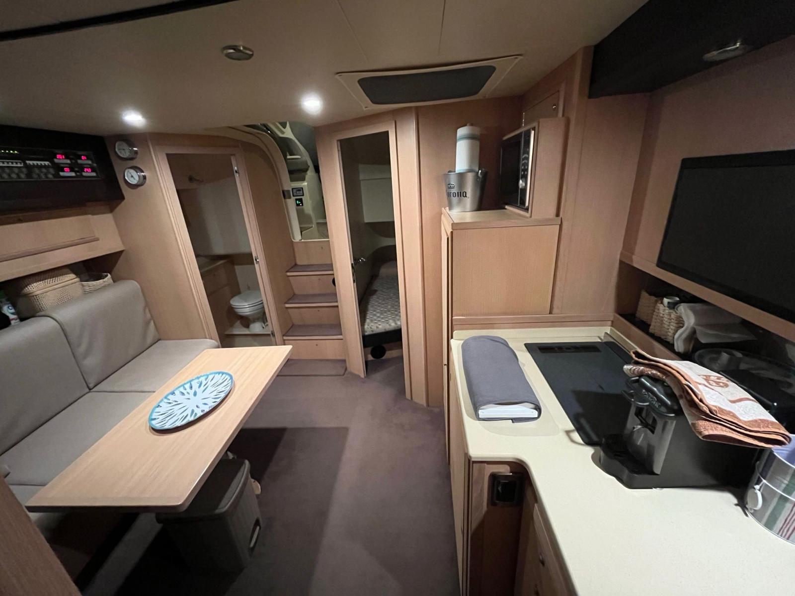 Di fronte alla dinette è presente un wet bar completo di lavello, piano cottura a induzione e frigorifero