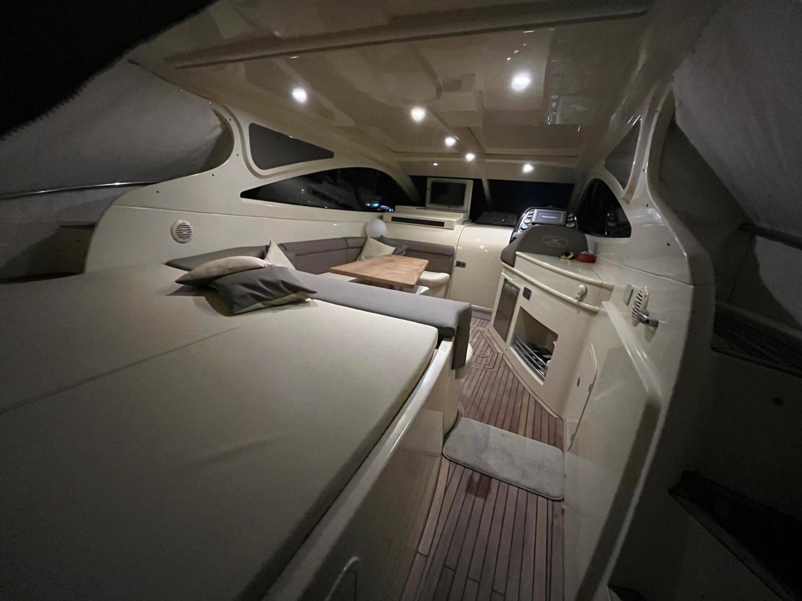 Sono presenti due aree dedicate al relax: un ampio prendisole fisso a poppa sopra il garage e un prendisole di prua accessibile tramite camminamenti laterali in teak