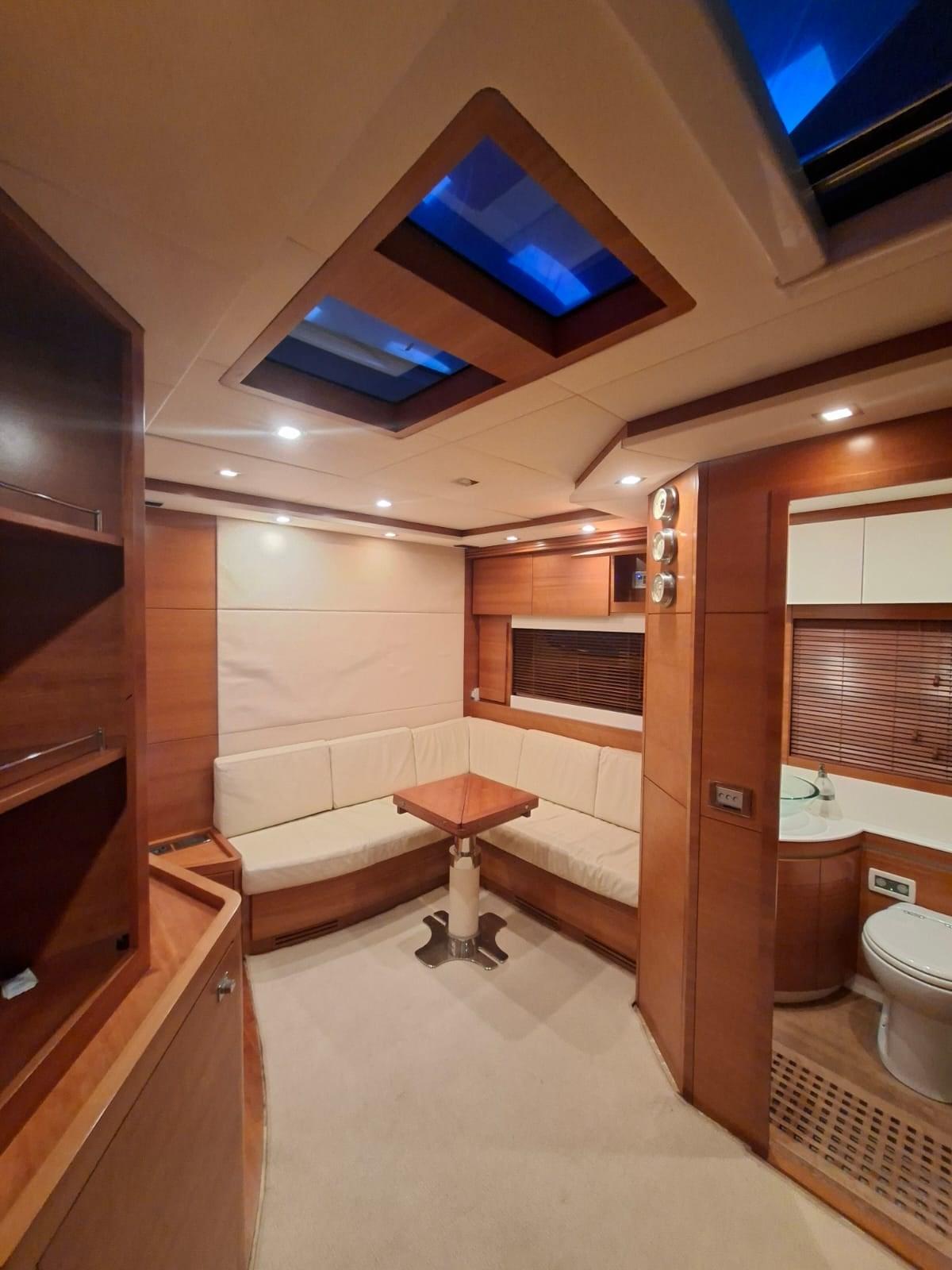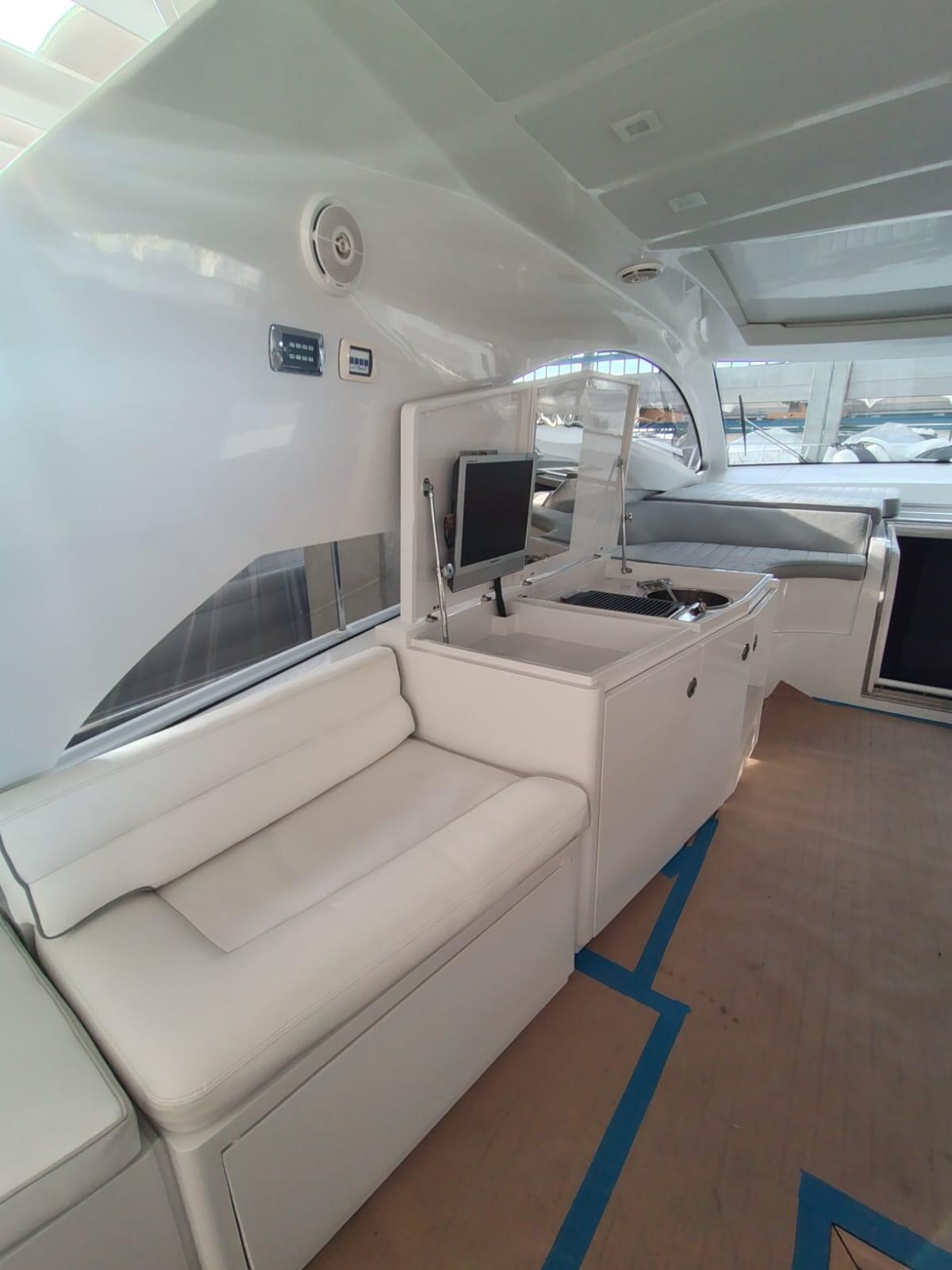 Acqua Calda, BBQ/ Grill, Boiler, Clima reversibile, Impianto acque nere, Indicatore del serbatoio del carburante, Indicatore del Serbatoio dell’Acqua, Indicatore della pressione dell’olio nel motore, Indicatore della temperatura del motore, Prese interne 12v, Prese interne 220v, Serbatoio Acque Nere, 2 WC marino elettrico.