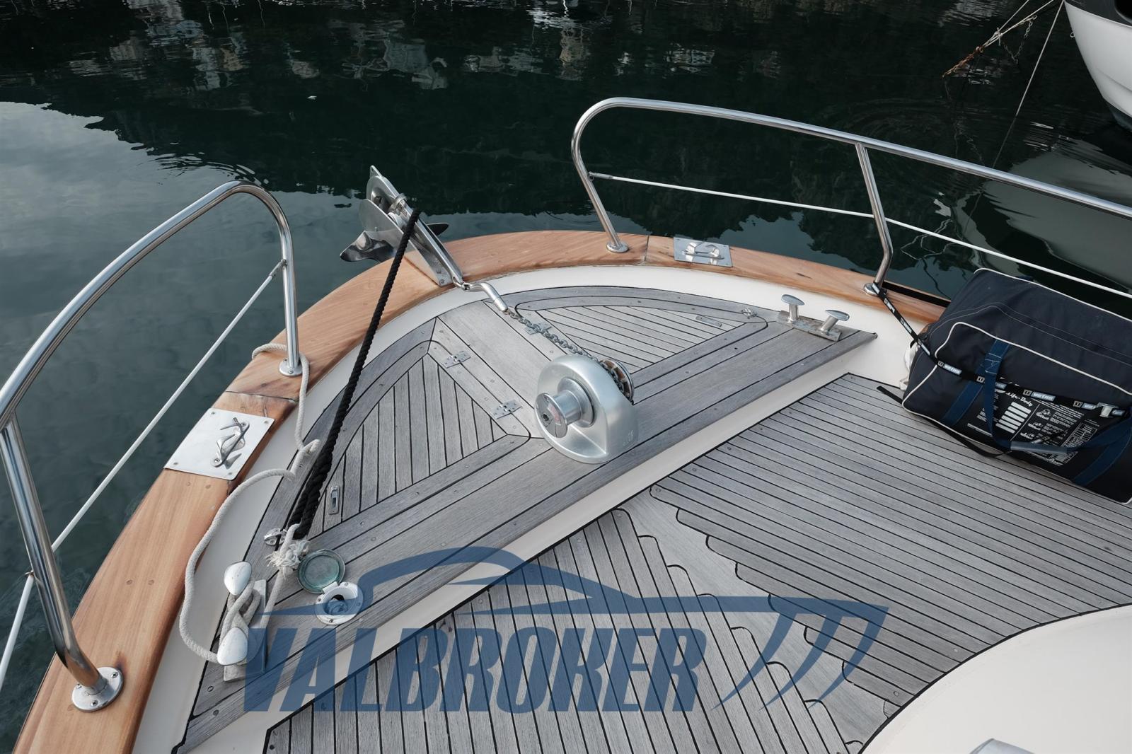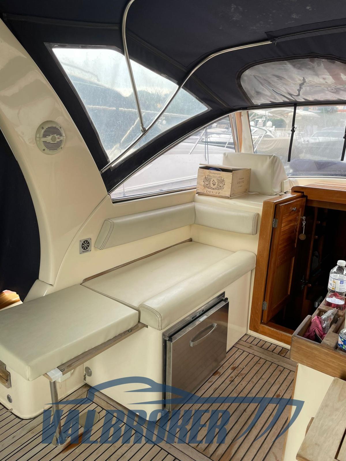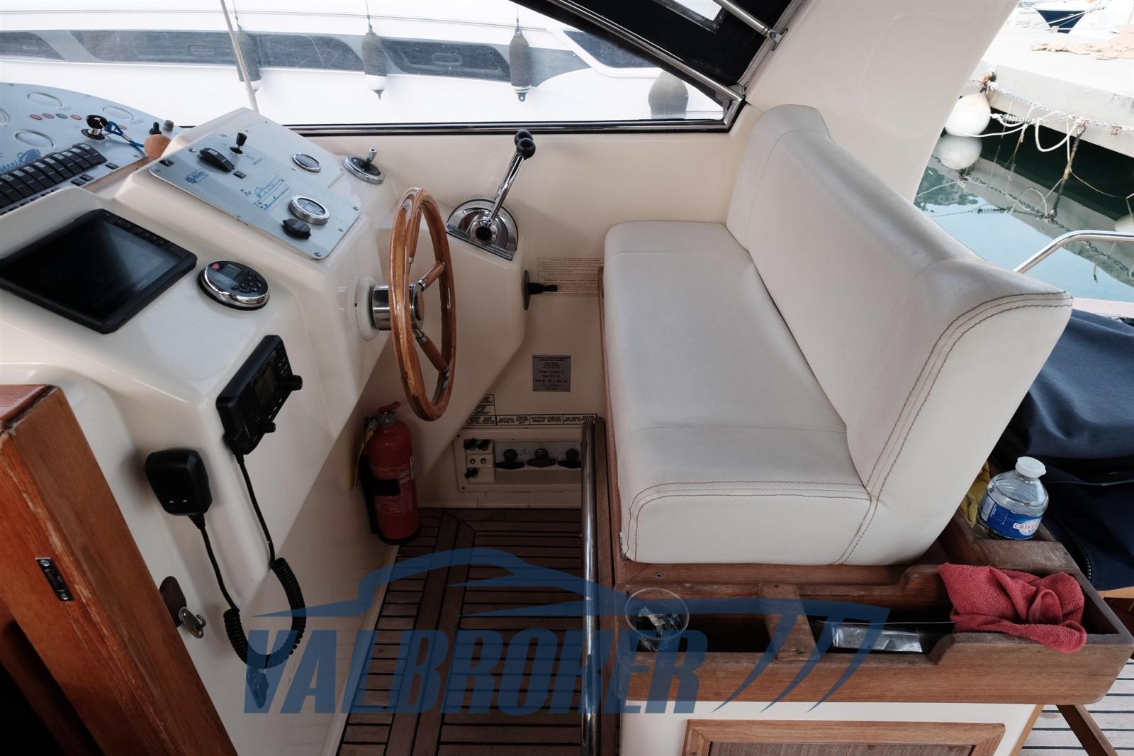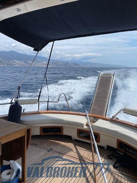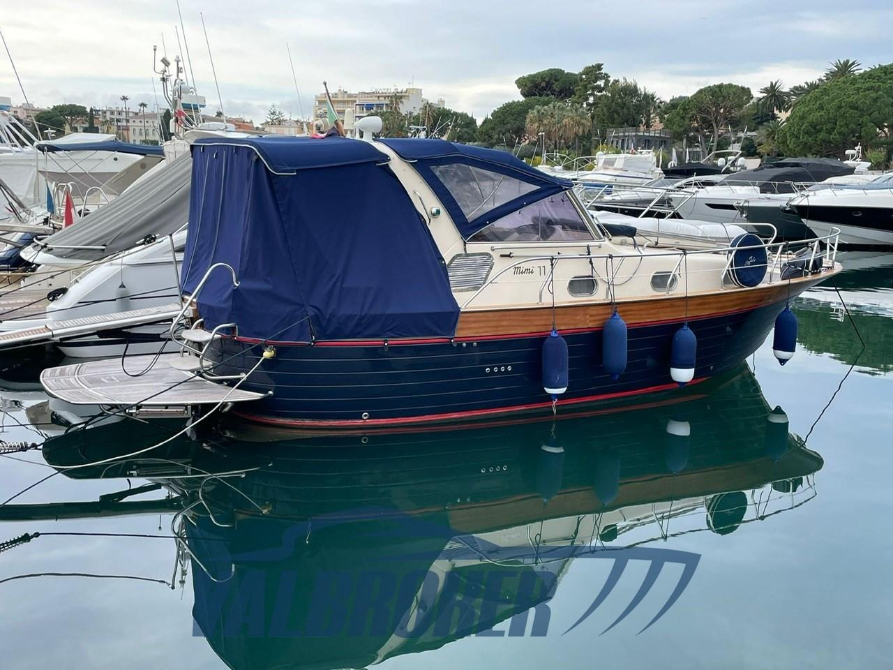 Imbarcazione in classico stile mediterraneo, Mimi Libeccio 11, Motori 2x300HP VM MD 706 LH, visibile in Costa Azzurra. Cabina a prua con porta, cucina e dinette trasformabile in letto matrimoniale. Bagno con doccia. Ampio pozzetto.