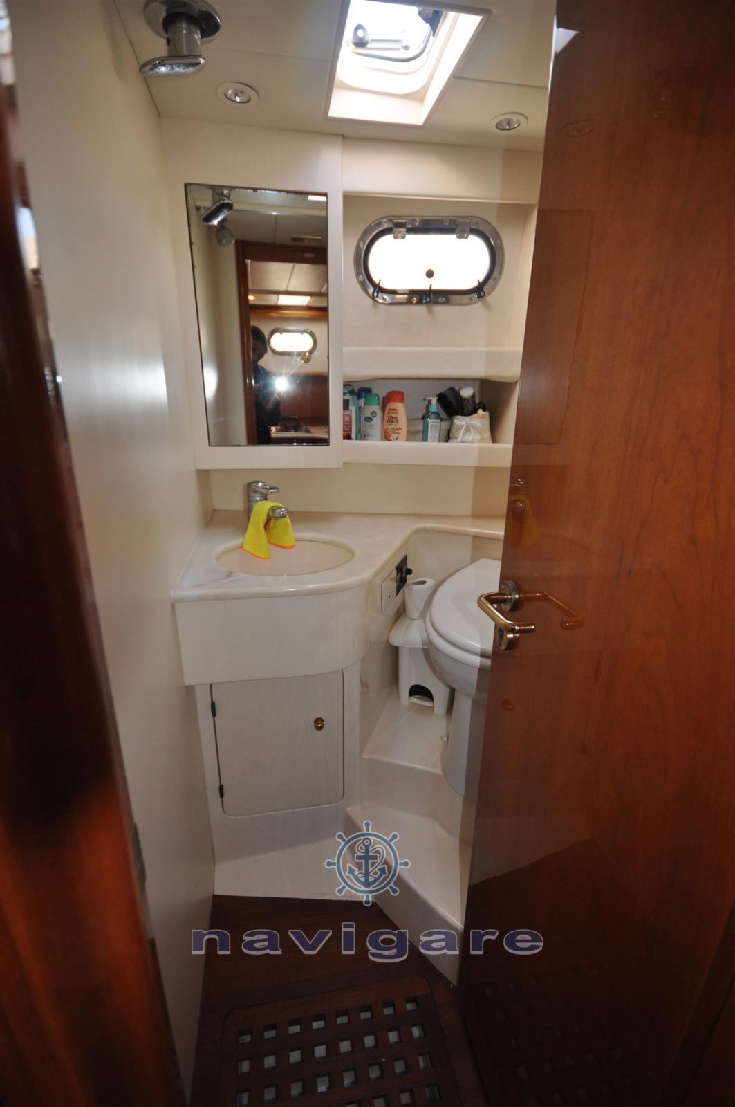 La carena a V profonda con angolo di 18° a poppa consente una navigazione morbida e piacevole. La disposizione degli arrediinterni, realizzata in pregiato ciliegio, conferisce un esclusivo comfort nell’eleganza più raffinata. Le cabine sono due doppie compresa quella dell’armatore, dotate del proprio bagno e doccia. L’area di centro poppa è suddivisa in due zone: il pozzetto superiore dove è situata la dinette con servizio cucina (fornibile su richiesta con Hard Top ad apertura elettrica), e il pozzetto di poppa per le attività nautiche.