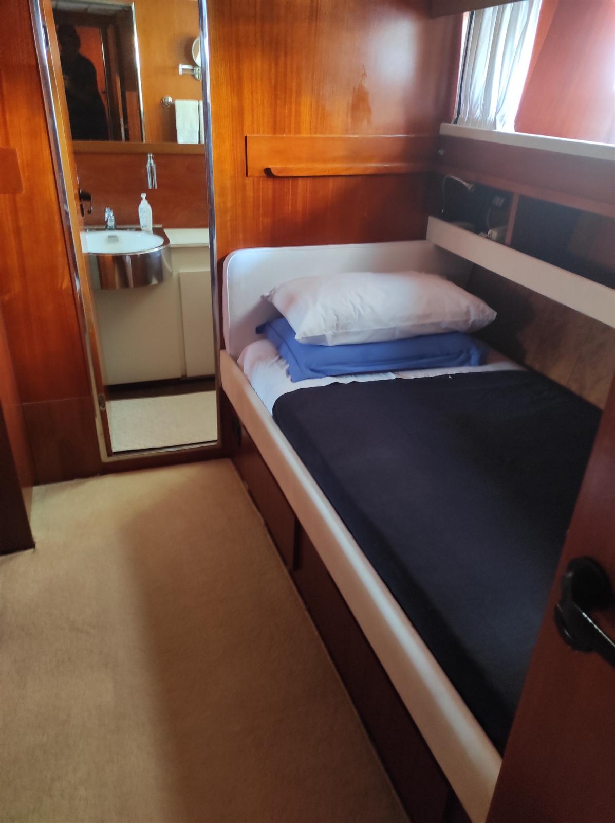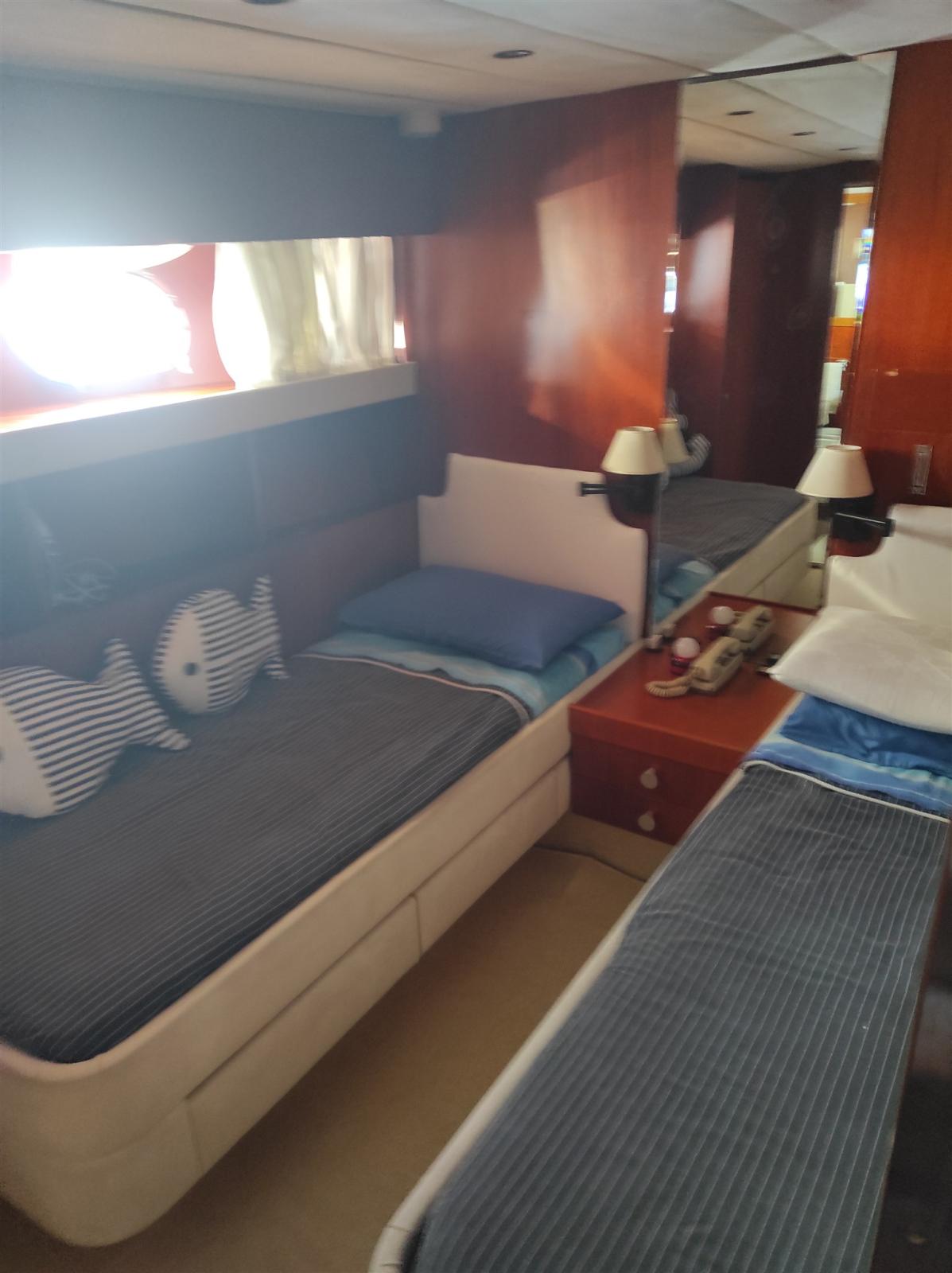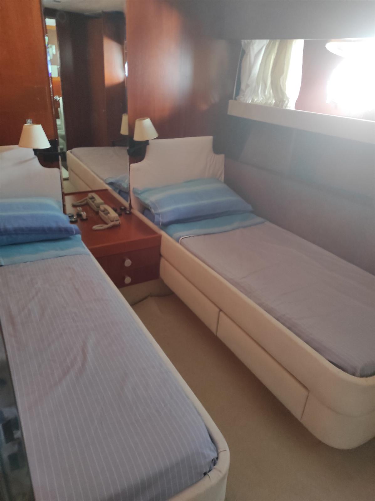 4 cabine e 4 bagni + 2 crew. cabina armatoriale con bagno privato e box doccia separato, 1 cabina singola con bagno privato, 2 cabine con letti paralleli e 3 letto a scomparsa.Attualmente in secca