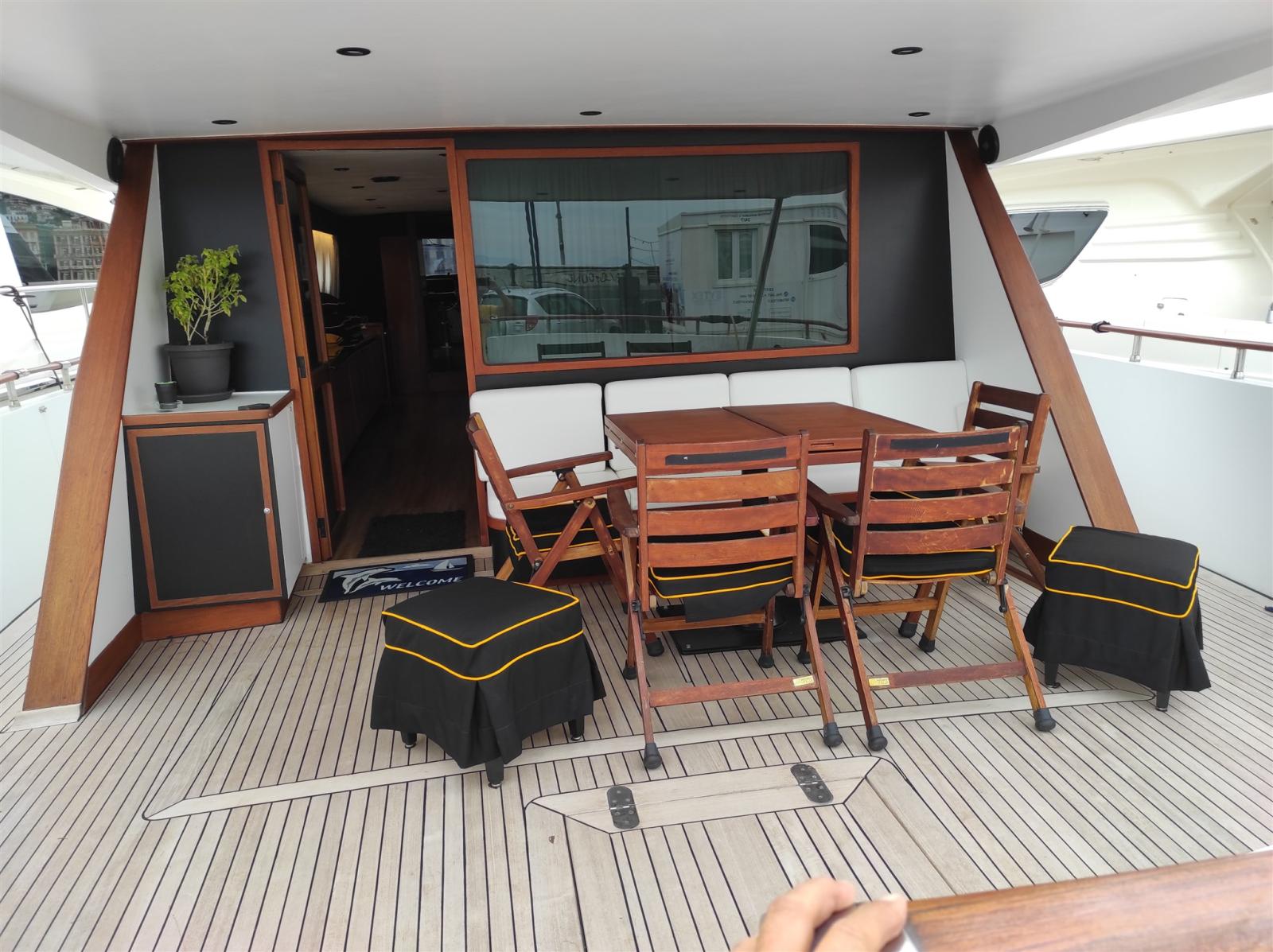 Autoclave, Doppia timoneria, Flap idraulici, Gruette per tender su fly, Impianto antincendio, Passerella (A scomparsa in teak), Piattaforma (Maggiorata teak), Pozzetto Teak, 2 Salpa Ancore Elettrico, Tavolo pozzetto, 2 Winch tonneggio di poppa.