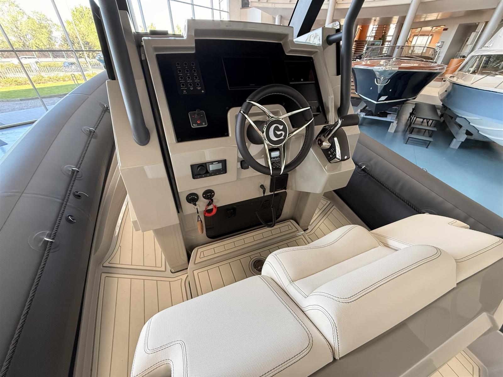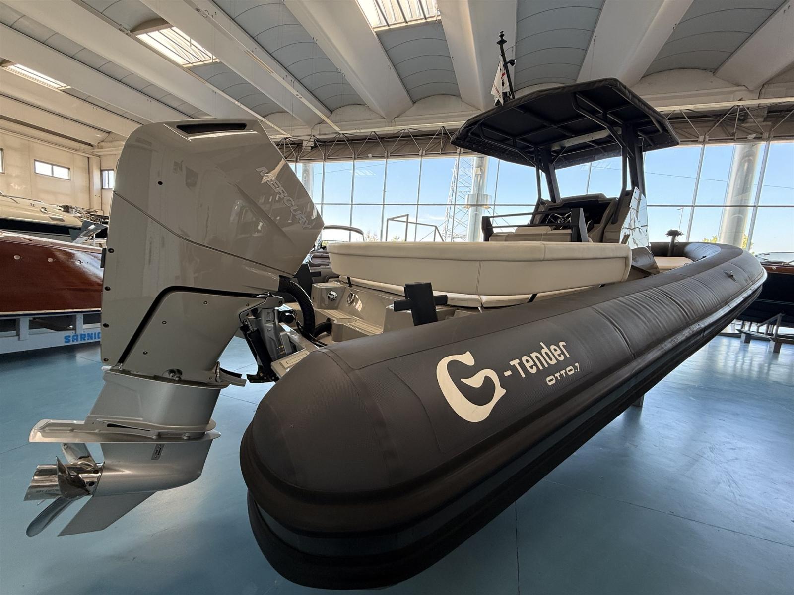 Questo G-Tender OTTO.7 si distingue per un’eleganza sobria e contemporanea, ottenuta attraverso una combinazione cromatica ricercata e materiali selezionati. I tubolari, le bitte e gli acciai interni sono rifiniti in una raffinata tonalità antracite, che crea un contrasto deciso con il grigio pietra dello scafo. Lo stesso colore è stato ripreso anche sulla calandra del motore, realizzata con una verniciatura custom che contribuisce a dare continuità stilistica e carattere all’insieme.