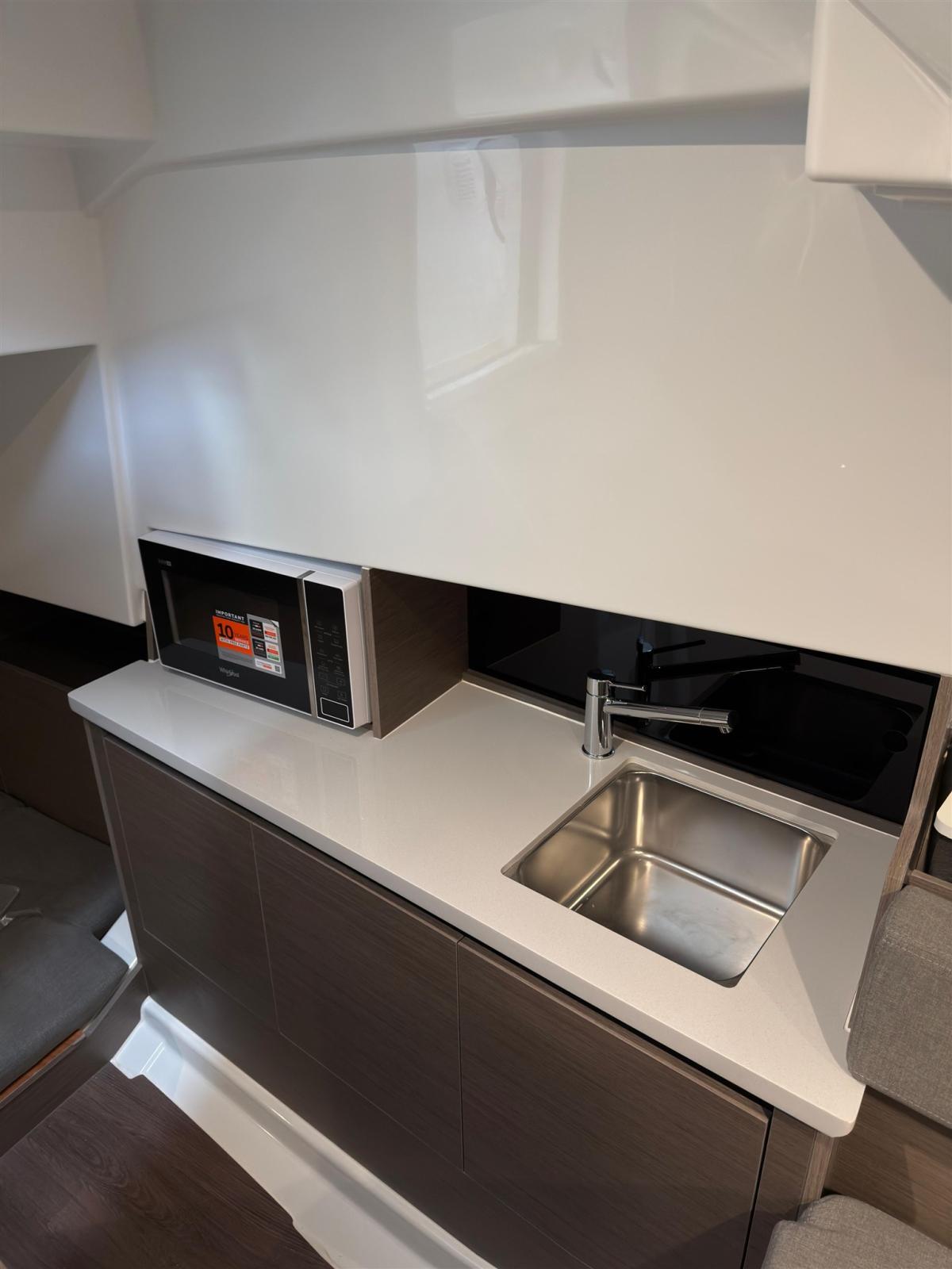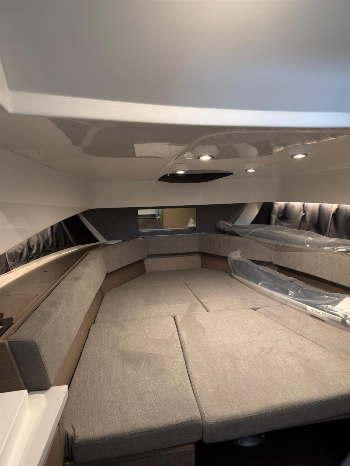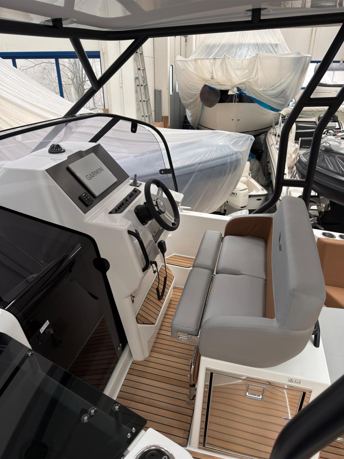 PILOT EDITIONScafo grigio Perla Decorazione dello scafo Pilot Edition Balconi in acciaio inossidabile laccati nero Volante sport T-Top (tetto poliestere e quadro in inox nero) con decorazioni Luci subacquee blu Rivestimento Linetex Glacier + Chalk - Seduta del pozzetto con schienale convertibile in piattaforma prendisole - Panca Bolster pilota e copilota - Prendisole di prua con schienale mobile - Panchetta pieghevole dietro l'asta per appoggiarsi Passauomo di coperta apribile Luci di cortesia LED nel pozzetto Tavolo del pozzetto in legno con piede telescopico trasformabile in plancetta prendisole