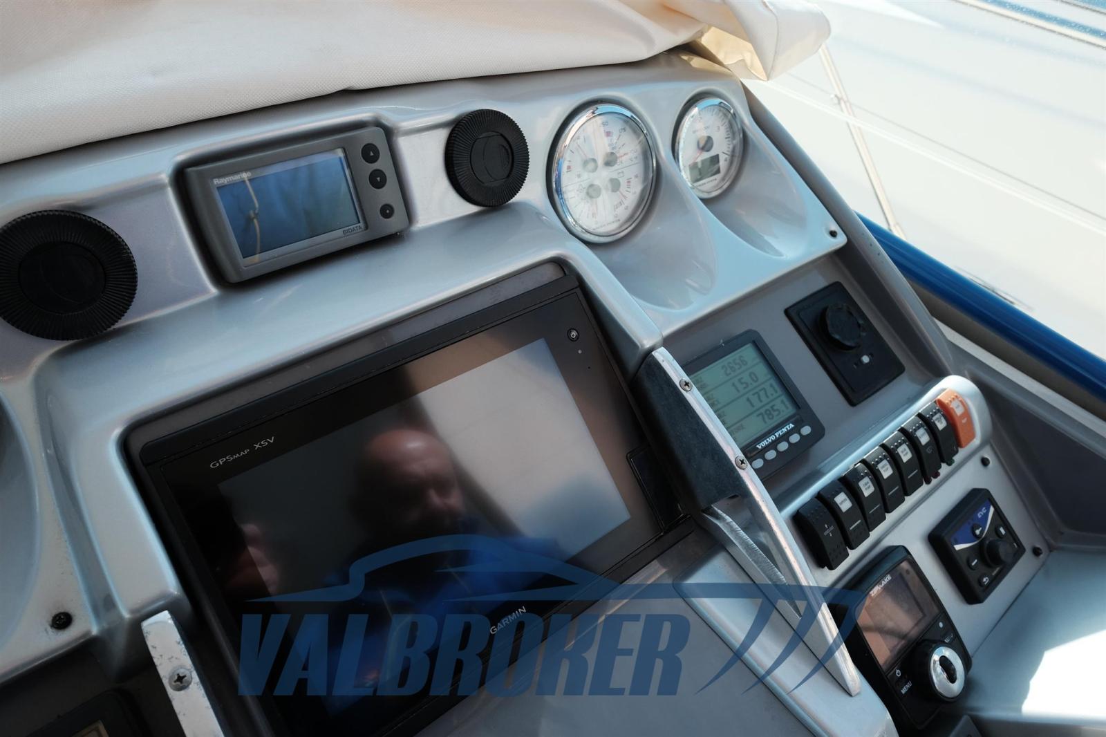 Comando motori elettronico, Contametri catena (Quick), Ecoscandaglio (Raymarine), GPS (XSV), Pilota automatico (Raymarine ST6002), Radar (Garmin), Radio VHF (Geonav).
