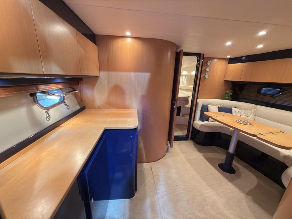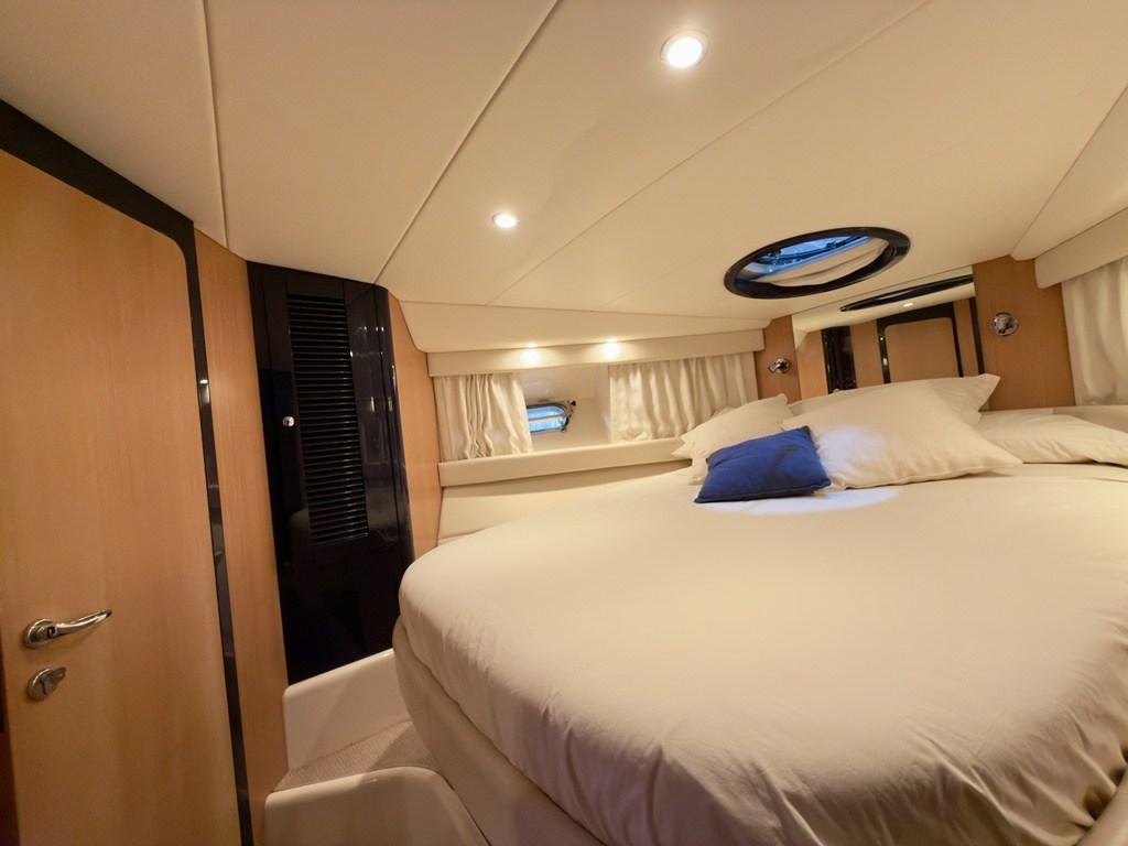 Gli interni, luminosi e ariosi, offrono una cabina armatoriale a prua con bagno indipendente, un salone con cucina e una cabina ospiti particolarmente ampia e confortevole, data la sua collocazione a centro barca.