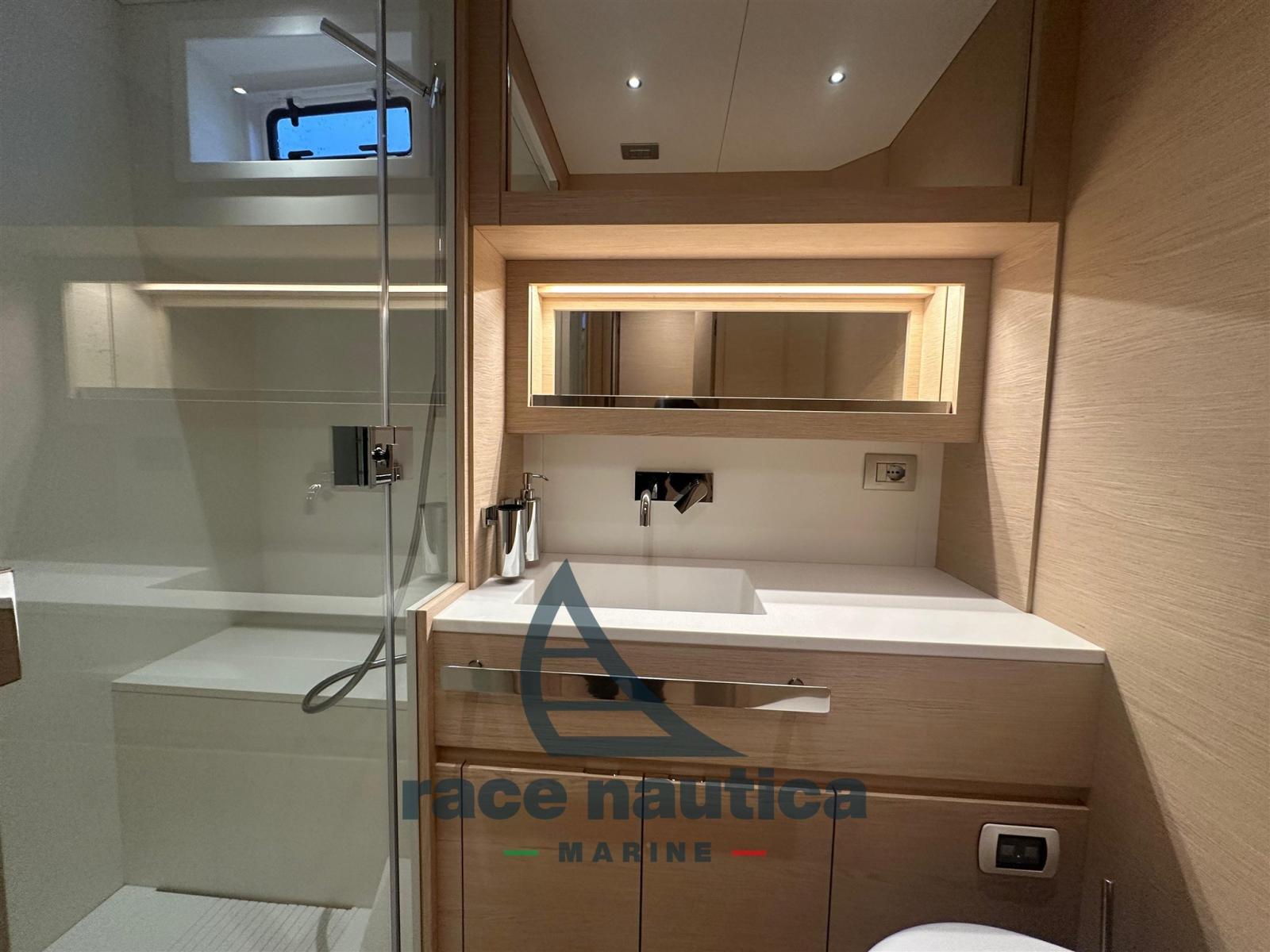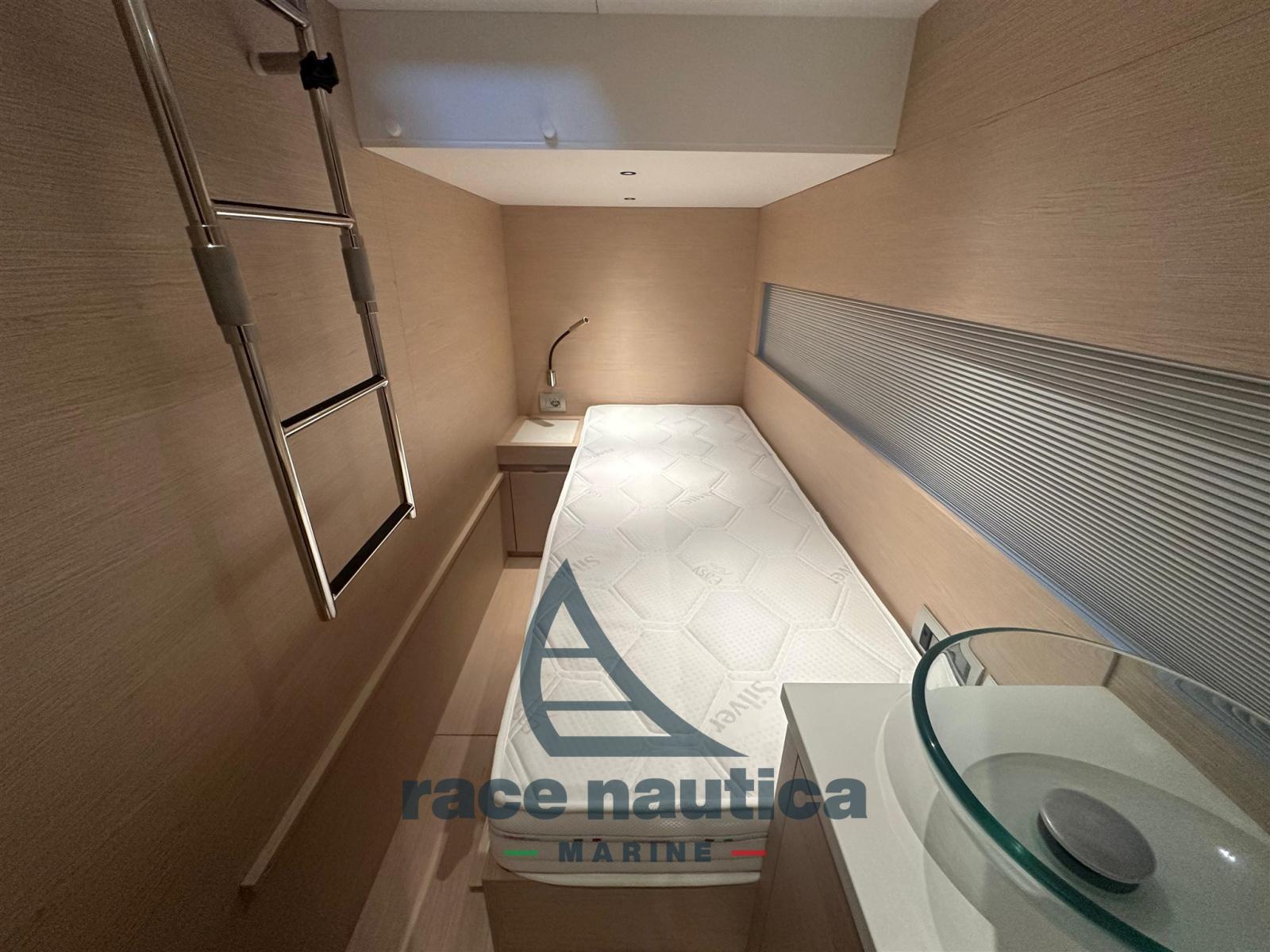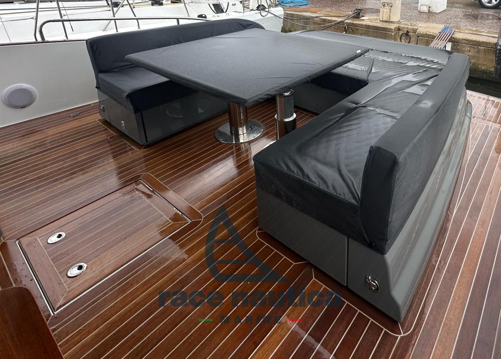 Motori Volvo Penta IPS 800, 100 Ore moto, Volvo dynamic positioning system, stabilizzatore seakeeper 6, elica di prua, scafo - sovrastruttura - coperta - prendisole di poppa verniciati con materiali alta temperatura e post curing, teak di coperta in legno naturale comento nero, supplemento per comento grigio, spiaggetta di poppa maggiorata parziale con sistema sali e scendi, tavolo abbattibile in pozzetto con due piedi elettrici, cuscineria extra e schienali reclinabili, sistema di varo tender con rulli e verricello elettrico, due bitte a scomparsa per tender nella plancetta di poppa, mobili in pozzetto per stivaggio e zona relax, supplemento disegno diamantato su tappezzeria esterna, oblò apribile a prua, oblò apribile a scafo cabina di poppa, pacchetto finestrini apribili, tetto scorrevole main deck, aria condizionata calda/fredda reversibile, aria condizionata per cabina marinaio, allestimento cabina marinaio, macchina del caffè e set stoviglie Solaris Power, ancora 35KG inox, Tavolo abbattibile in dinette con piede elettrico e cuscineria divano, contacatena digitale, faro elettrico, kit dotazioni ormeggio, pacchetto TV, TV LCD in dinette con saliscendi, sound system, batteria servizi aggiuntine 180ah, inverter 2500W, luci notturne esterne camminamento, 2 prese stagne 220v a murata,due display Volvo da 16" più un terzo, Radar GMG Fantom 40w, Garmin AIS - 800RX/Tx, Generatore 12kw, tendalino di prua con pali estraibili, pacchetto cover, tendalino elettrico integrato in tuga, parasole per parabrezza di prua e vetri tuga, scala castom, pedana poggia piedi timoneria, kit tientibene, biancheria da letto, tientibene scale interne.