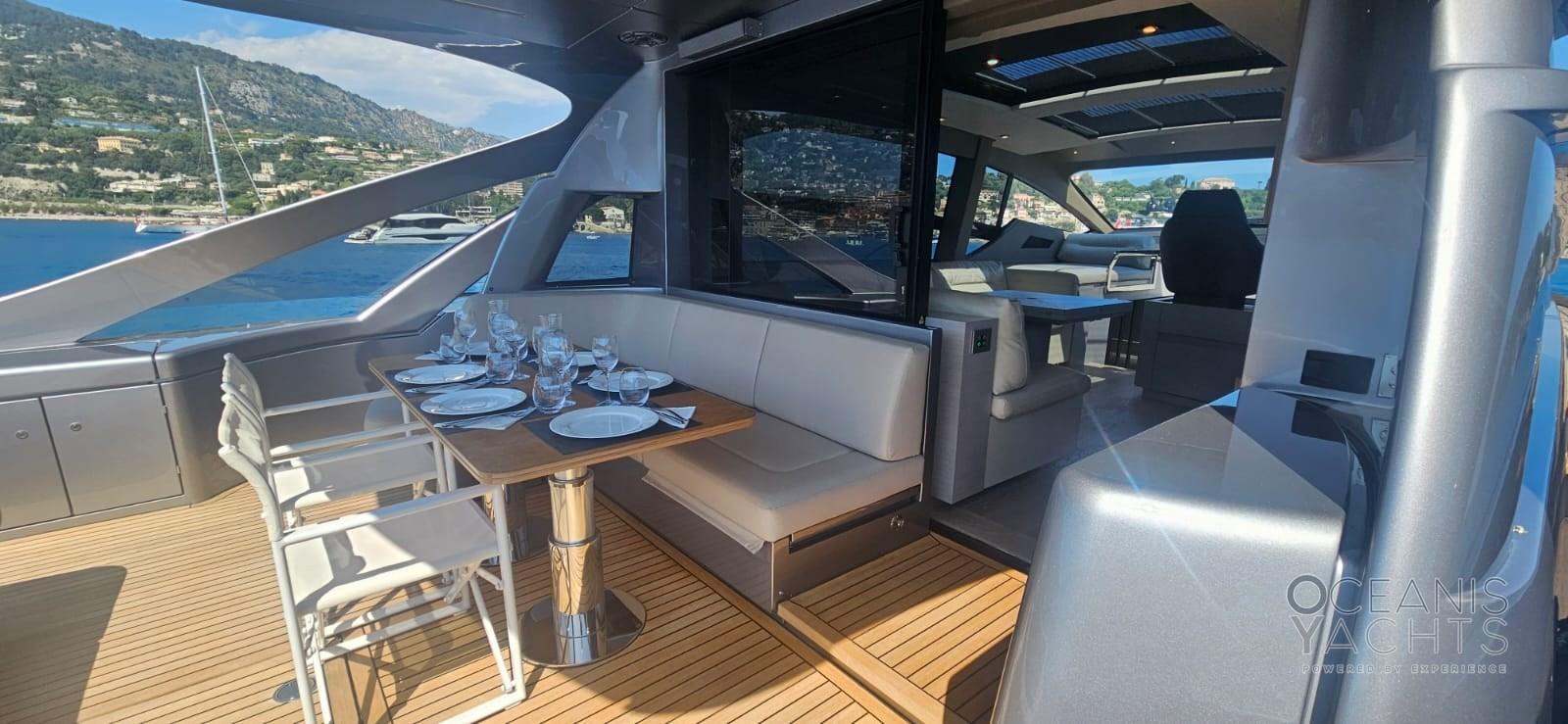 Allarme sentina, Ancora (Bruce galvanised anchor (50kg)), Autoclave, Auto-Trim, Bitte Abbattibili, Camminamenti laterali in teak, Cavo corrente di banchina, Corrimano, Doccia esterna, Garage per tender, Impianto antincendio (Installed in engine room), Luci di cortesia, Luci subacquee, Parabordi, Passerella (Telescopic hydraulic hideaway gangway (2 remote controls)), Piattaforma (Hydraulic lift for tender launch/recovery), Porta ingresso, Porta laterale, Presa 220V banchina, Presa acqua banchina, Scaletta da bagno, Selle per Tender, Stabilizzatori (Seakeeper 6 Gyro), Tavolo pozzetto, Tavolo Salone Abbattibile, Tender, Tromba.