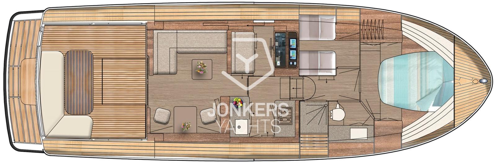 La caratteristica disposizione open open della berlina rimane al centro del design. Porte doppie, ampie e che si aprono verso l'esterno collegano senza soluzione di continuità il salone con la cabina di pilotaggio aperta, trasformando lo spazio in un'unica grande area abitativa continua. Questo crea un'esperienza a bordo unica, avvicinandoti all'acqua e permettendo una vita senza sforzo sia dentro che all'esterno.
