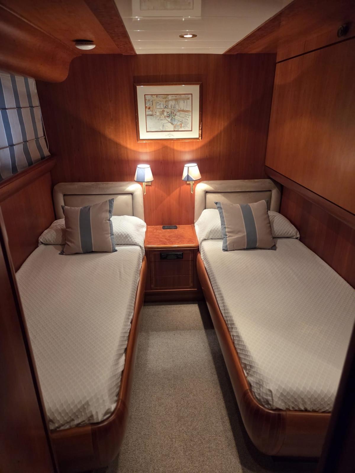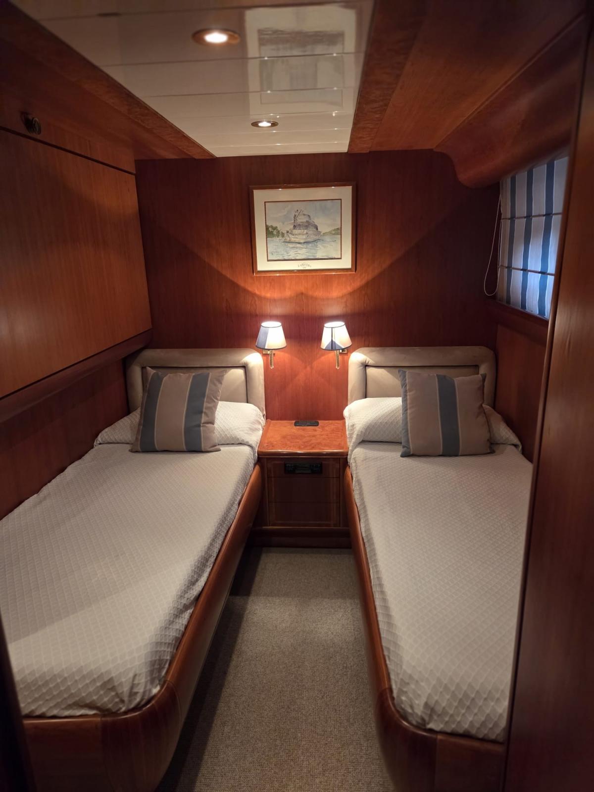 Cabina armatoriale con letto matrimoniale, cabina armadio e bagno - cabina Vip con letto matrimoniale e bagno - cabina ospiti con due letti in piano, terzo letto a scomparsa e bagno - cabina ospiti con due letti in piano, terzo letto a scomparsa e bagno.