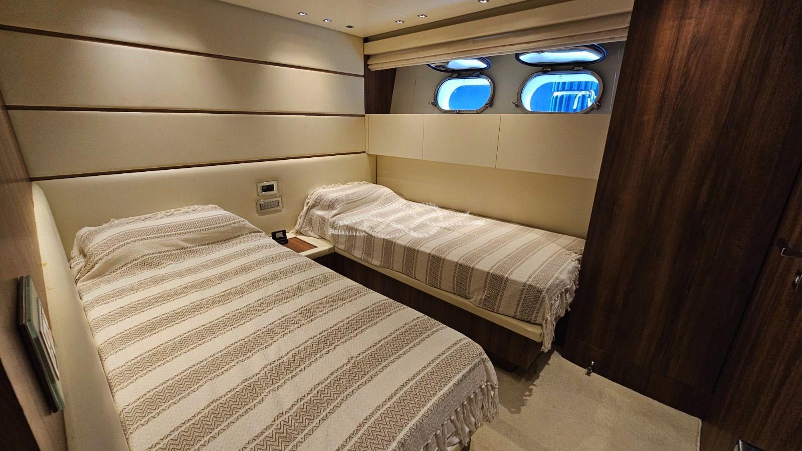Cabina armatoriale con letto matrimoniale, cabina armadio e bagno - cabina Vip con letto matrimoniale e bagno - cabina ospiti con due letti in piano e bagno - cabina singola con bagno.