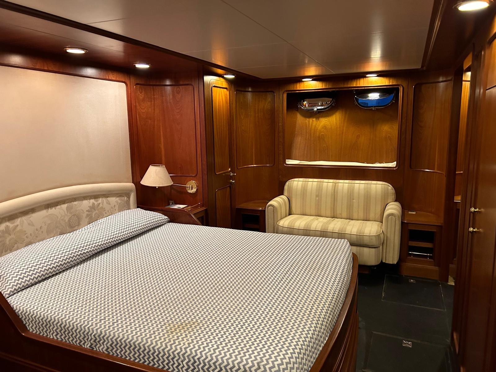 Cabina armatoriale con letto matrimoniale, cabina armadio e bagno con vasca e doccia separata - cabina Vip con letto matrimoniale e bagno - cabina ospiti con due letti in piano e bagno - cabina ospiti con letto singolo e bagno.
